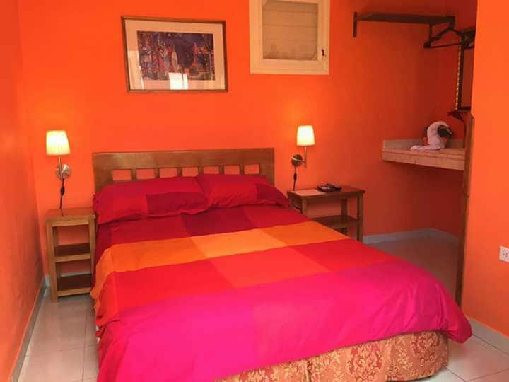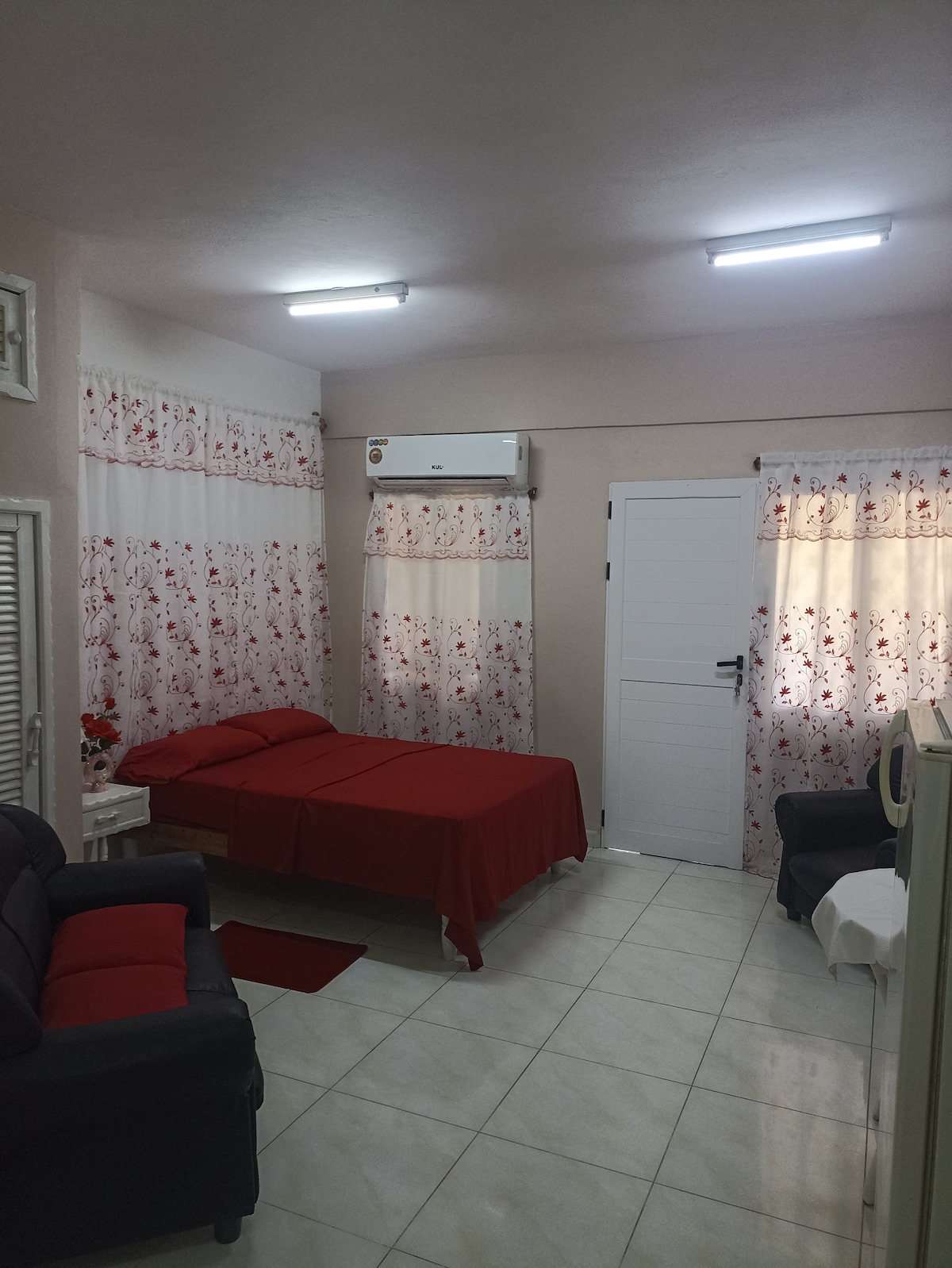 Es un apartamenento independiente amplio. Con un dormitorio con dos camas, (una grande y otra más pequeña), aire acondicionado, caja fuerte, perchas para la ropa y televisor. Un baño con agua fría y caliente; cocina equipada con todo para la elaboración de alimentos (microondas, cafetera, tostadora, ollas, fogón de gas, refrigerador), una pequeña mesa plegable y tres taburetes para comer, uso de la lavadora. Una terraza común rodeada de plantas con sillones, mesa y sillas y un hermoso jardín.
