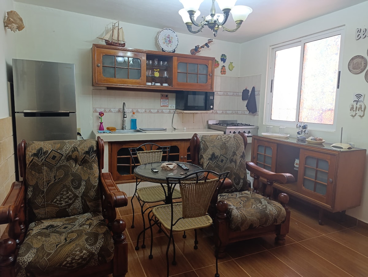 Es un apartamenento independiente amplio. Con un dormitorio con dos camas, (una grande y otra más pequeña), aire acondicionado, caja fuerte, perchas para la ropa. Un baño con agua fría y caliente; cocina equipada con todo para la elaboración de alimentos (microondas, cafetera, tostadora, ollas, fogón de gas, refrigerador), barra y tres taburetes para comer, sala con televisor y una terraza común rodeada de plantas con sillones, mesa y sillas y un hermoso jardín. Pueden utilizar la lavadora.