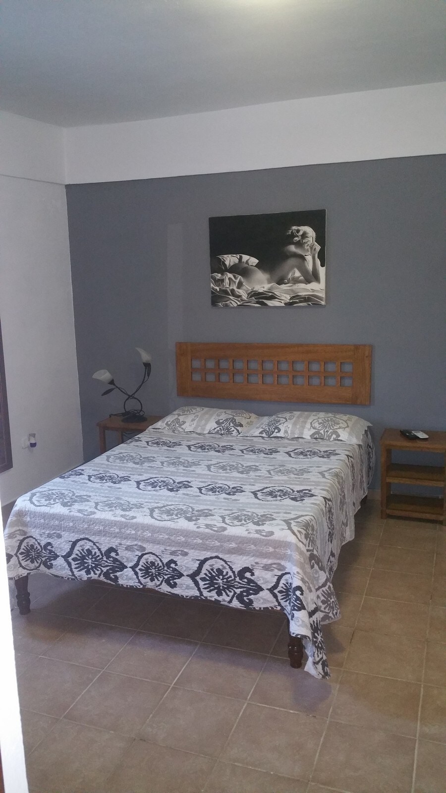 Es un apartamenento independiente amplio. Con un dormitorio con dos camas, (una grande y otra más pequeña), aire acondicionado, caja fuerte, perchas para la ropa y televisor. Un baño con agua fría y caliente; cocina equipada con todo para la elaboración de alimentos (microondas, cafetera, tostadora, ollas, fogón de gas, refrigerador), una pequeña mesa plegable y tres taburetes para comer, uso de la lavadora. Una terraza común rodeada de plantas con sillones, mesa y sillas y un hermoso jardín.