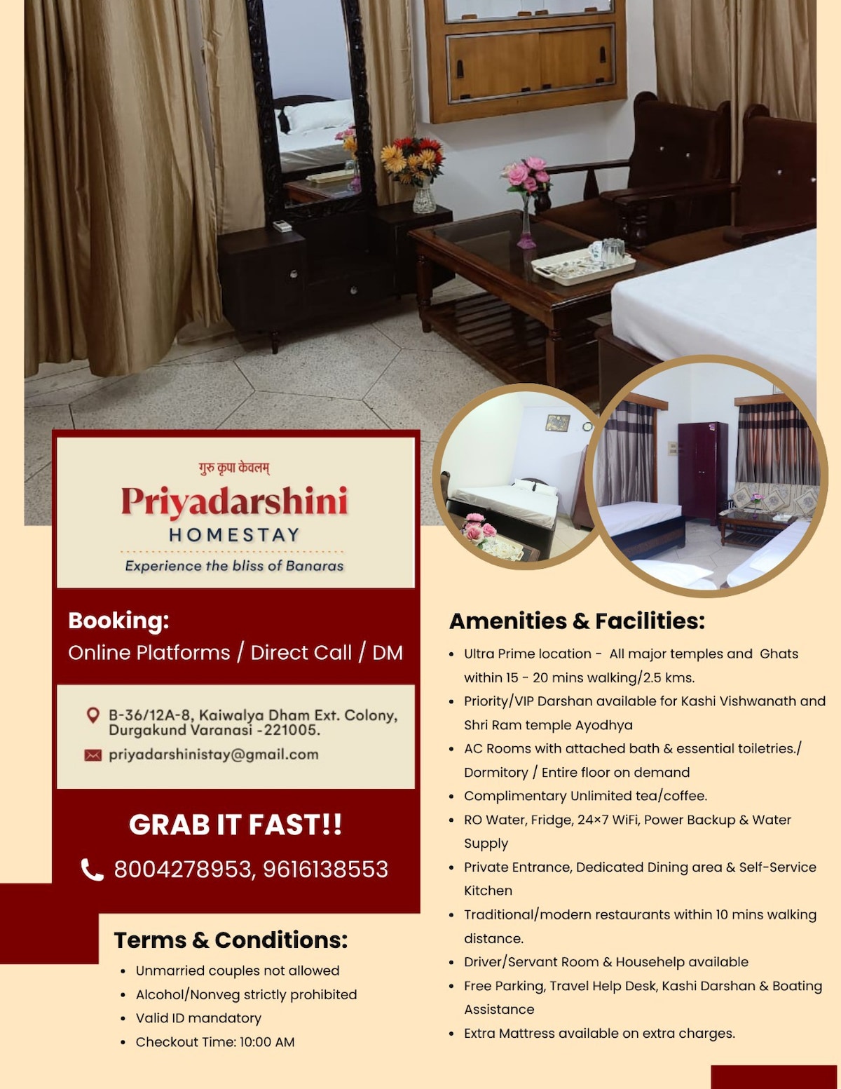 Your family will be close to everything when you stay at this centrally-located place. This space is in market area and all famous temples are in 3-4 km radius. Kashi Vishwanath temple is 2 Km away from our Property. We provide free parking. We Provide Air conditioned Rooms. Transportation is easily available at doorstep. We provide kids friendly environment. Updated on 1st April, 2025.