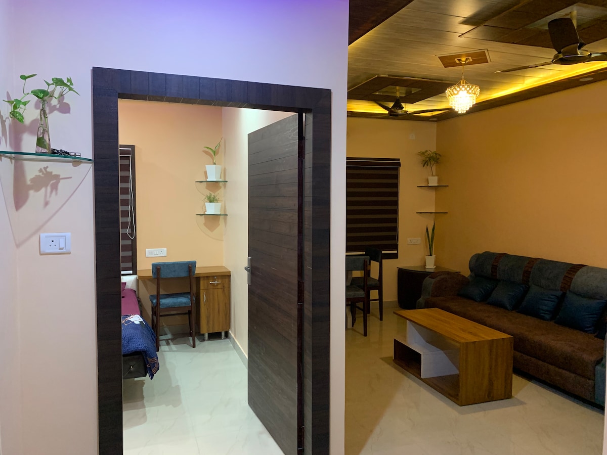 Our house is located in the heart of the city in a quiet, residential gated society. It is a clean, well-ventilated space with nice daylight in every room. We've left no stone unturned to make sure you don't miss your home when you're staying with us. You'll be able to enjoy: -A fully functional kitchen with all the essentials well-stocked. -An independent terrace & two balconies. -Parking - Two bedrooms and two modern washrooms