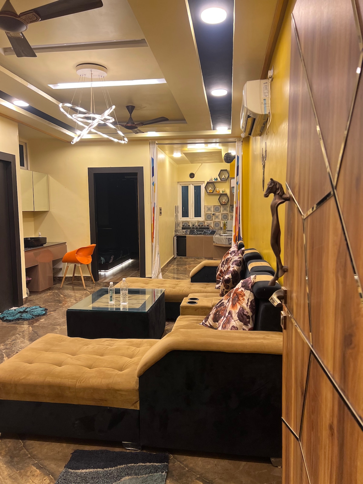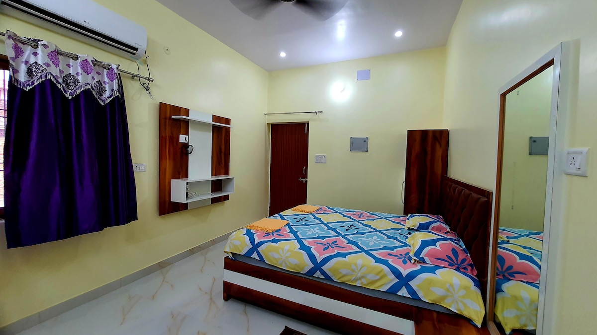 Relax with the whole family at this peaceful place to stay. A luxurious unit with three bedrooms , a living area and a kitchen with all the necessary things. This property is in the colony from main road 100 m distance ,the road to the colony is a bit rough but i am always available for our guest - Fully air conditioned - Fully equipped kitchen with RO - Free WiFi -TV units in each bedrooms - Neat and Completely Sanitised - Free Parking *Cab , Auto and E-Rickshaw available on call.