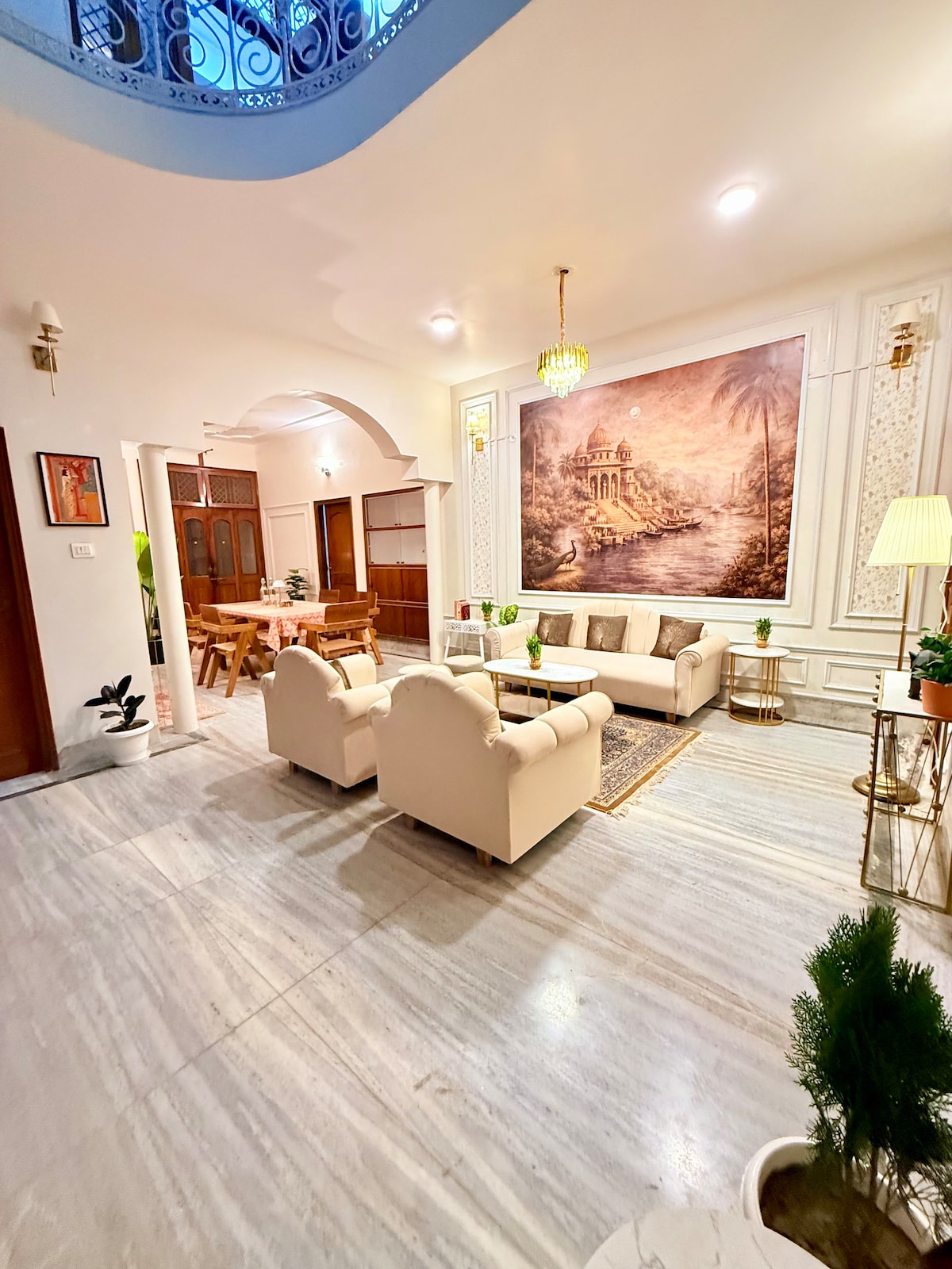Experience this truly one-of-a-kind penthouse in the holy city, Benares! The house boasts stunning architecture and aesthetic interior finishing creating an amalgamation of colors from Greece and inspiration from the Ghats of Benares. The terrace is designed and illuminated keeping in mind the social media and photography enthusiasts. What’s more? It has an original boat from the Ganges, so you can enjoy the view and relax while listening to the water from the hand crafted bamboo fountain.