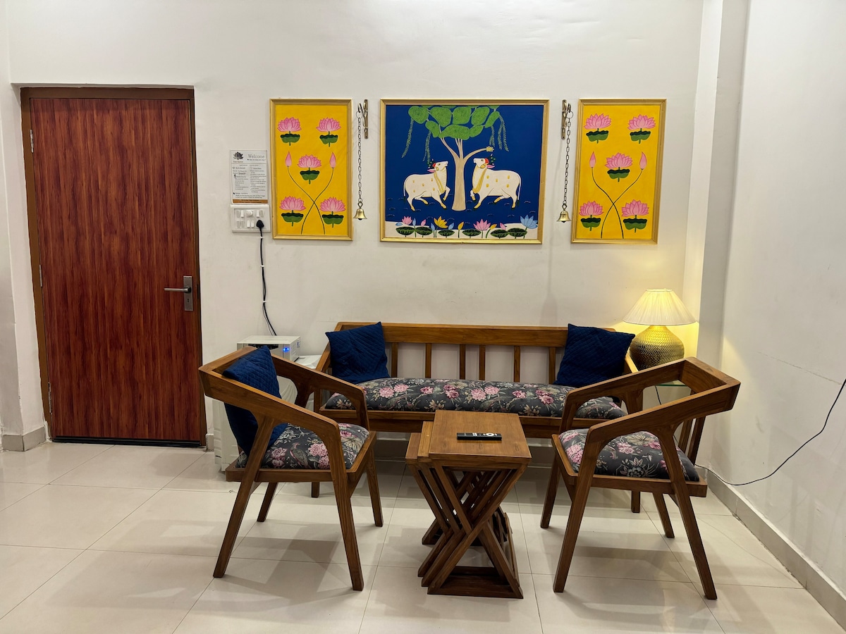 Welcome to 04 | Pichwai House – Across the Ghats, a thoughtfully designed two-bedroom apartment located in Gurudham Colony. The apartment is inspired by traditional Pichwai art and features hand-painted wall artwork by a local Banaras artist. It blends cultural character with modern comfort, making it ideal for families, couples, or small groups who want both convenience and authenticity. You stay close to the ghats and temples, but away from the noise and congestion of the old city lanes.