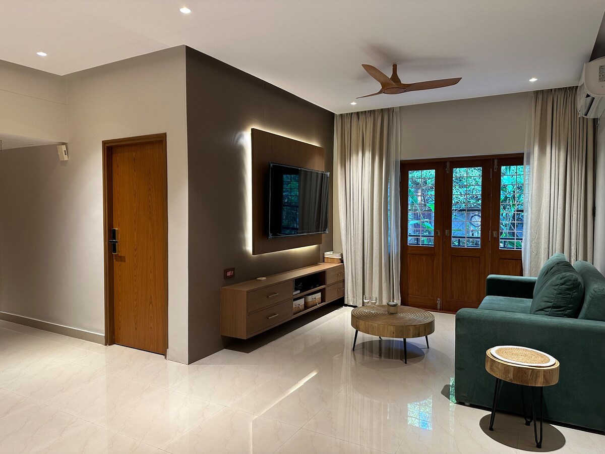 This tastefully decorated Studio Villa nestled in Cavelossim features a large living room with a double bed and a kitchen. The studio room is outfitted with all the appliances you need including a fridge, TV, microwave and air-conditioning with back up power. A cozy sit-out is also there outside to enjoy your evening coffee with a book. There are sun beds on the lawn for endless reading and sunbathing. We have 2 swimming pools in the community that you can use.