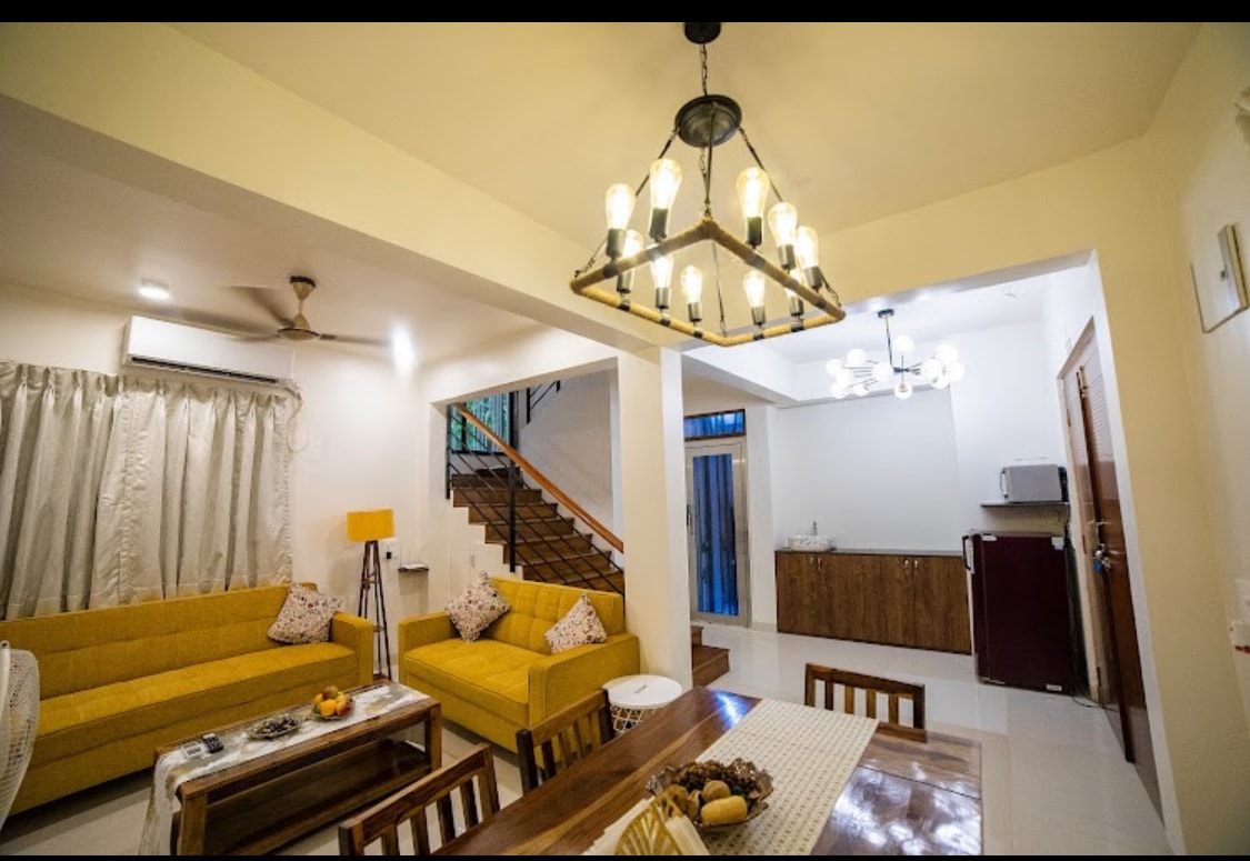 Located just a km walk from the beach and Taj exotica, this duplex in a gated complex offers breathtaking views of the fields from your balconies. The first floor boasts two ensuite bedrooms, while the second floor features a living space with kitchen. It takes 15 steps to reach the first floor. Enjoy access to the society’s large swimming pool, which is open from 8:00 am to 7:00 pm. Swimwear is mandatory. Note: Loud music and parties around the pool and balconies are strictly prohibited.