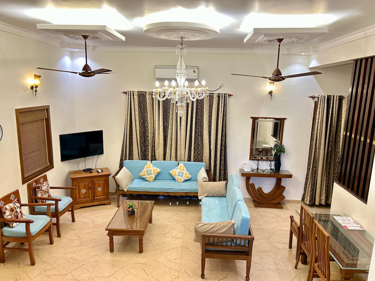 A hidden gem tucked away in Panjim's poshest zip code. Our 2BHK penthouse has a private terrace and is a short walk from Miramar beach. A Goan sanctuary surrounded by greenery; the open-plan, sprawling living room transforms into a chic space after sunset with designer ambient lighting. The famous promenade, grocery stores, and cafes are just a stroll away. Fontainhas & casinos are a short drive away. Enjoy high-speed WiFi if you’re working from home. PS: Look for peacocks in the morning!