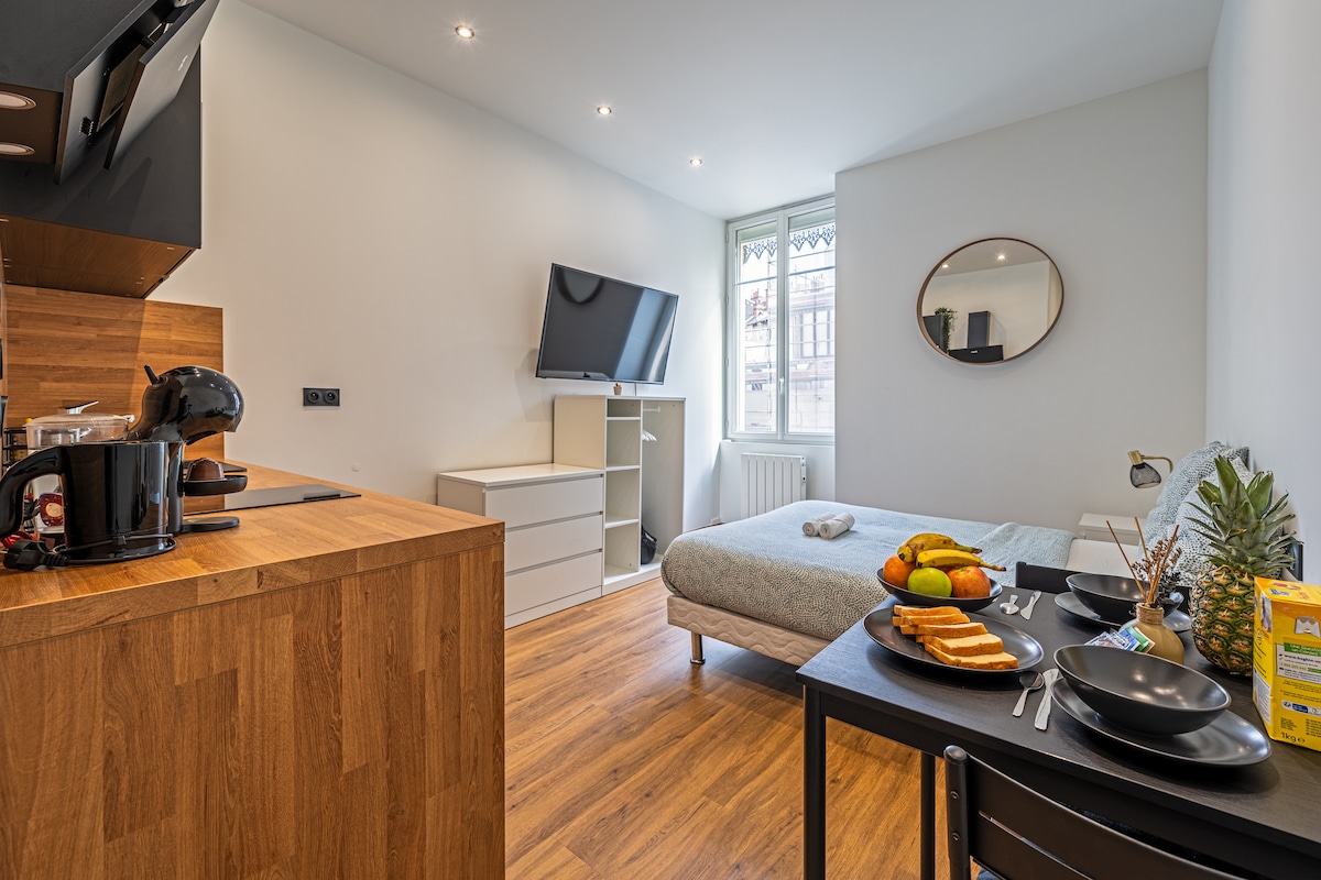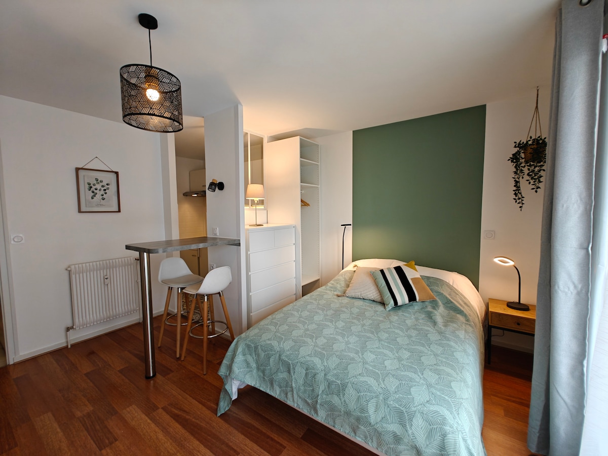 Studio lumineux entièrement refait à neuf ! ☀️ Logement à deux pas de la gare, proche de l'hyper-centre et de toutes les commodités. Immeuble avec ascenseur, calme, récemment rénové et totalement sécurisé. Entièrement équipé : lit queen size, machine à laver, lave vaisselle, machine à café, four, bouilloire, grille pain, sèche cheveux, fer à repasser, ...
