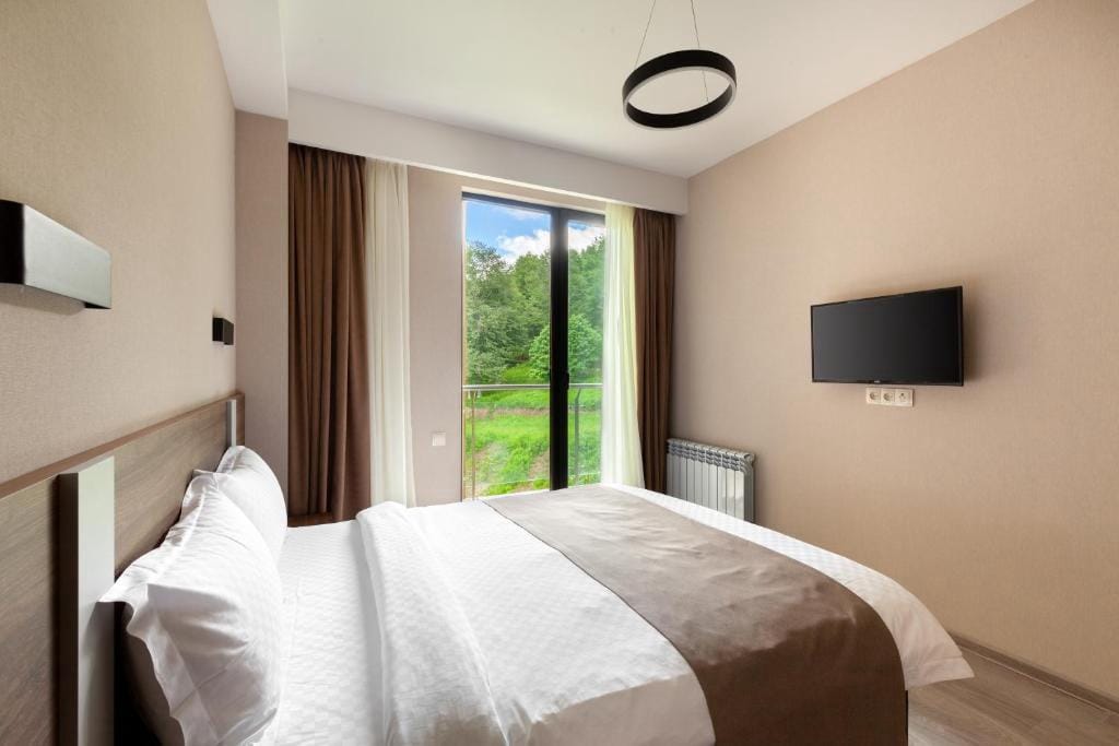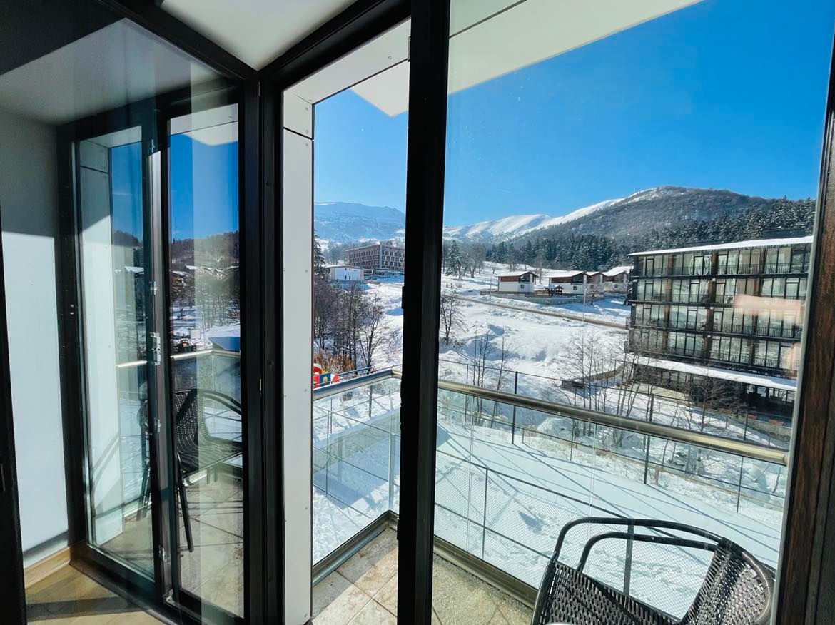 Mountain View Apartments for 3 Guests with Balcony and kitchen. Newly renovated 34 sq.m. Double or Twin Room with Charming Mountain View in the apart hotel "Didvelli Gallery" is located in Bakuriani near Didveli skiing area. Rooms are fully equipped with all amenities you need for comfortable stay. Also, Guests may use any services provided by the hotel (Cleaning, Parking, Restaurant etc.).