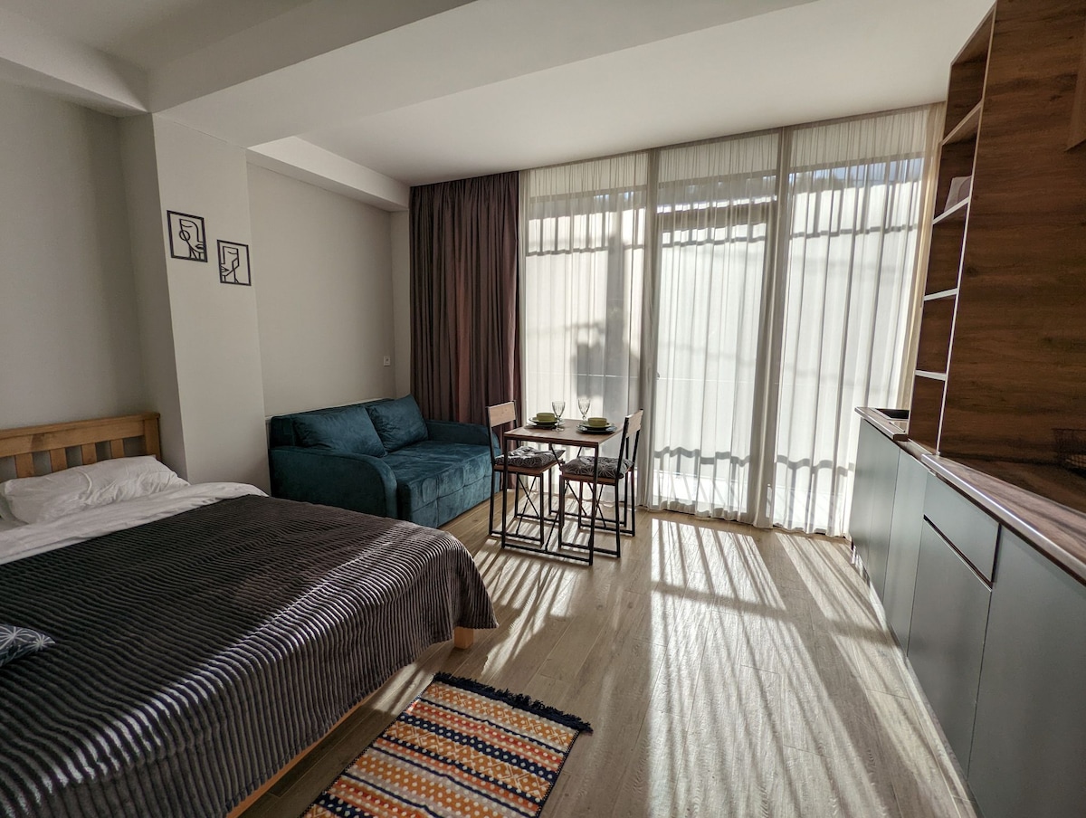 Come and relax in this calm, stylish space at the famous ski resort Bakuriani. The newly renovated studio offers view of the pine forest and mountains and includes a bedroom with a queen bed and sleeping sofa, a kitchen with tableware, refrigerator and a microwave, bathroom and balcony. There are plenty outdoor activities like skiing and hiking. One of the best skiing routes Didvelli - in just 300 meters. A pool and sauna (separately charged) are available at the residential complex Orbi Palace
