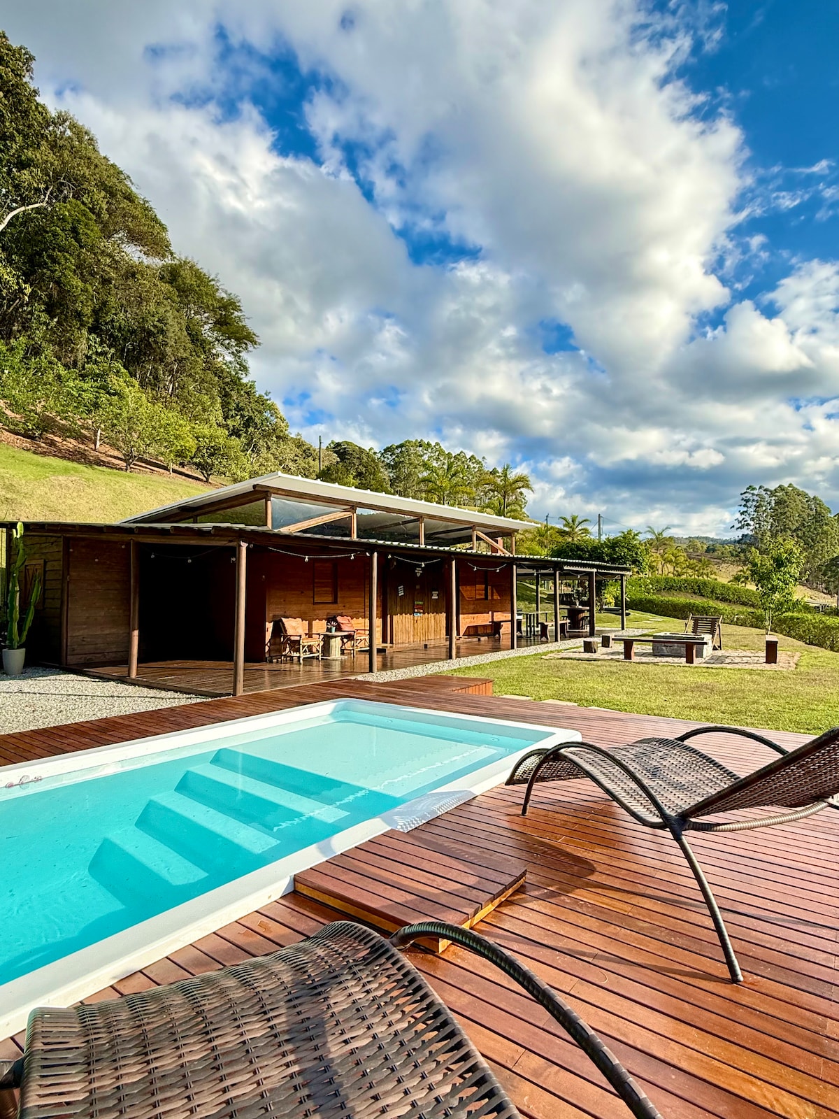 Espaço aconchegante, na área rural, com Wi-FI, a 18km da Cach. de Matilde, 8km da Cach. Vovó Lúcia. Clima agradável devido à sua localização aos 700m de altitude. Possui uma casa simples com duas suítes, sala/copa, além de mais três suítes independentes. Há espaço para colchões, havendo também espaços para montar barracas. Local ideal para confraternizações ou mesmo para um final de semana em família. Conta com fogão industrial, além de fogão à lenha/forno,churrasqueira e piscina.