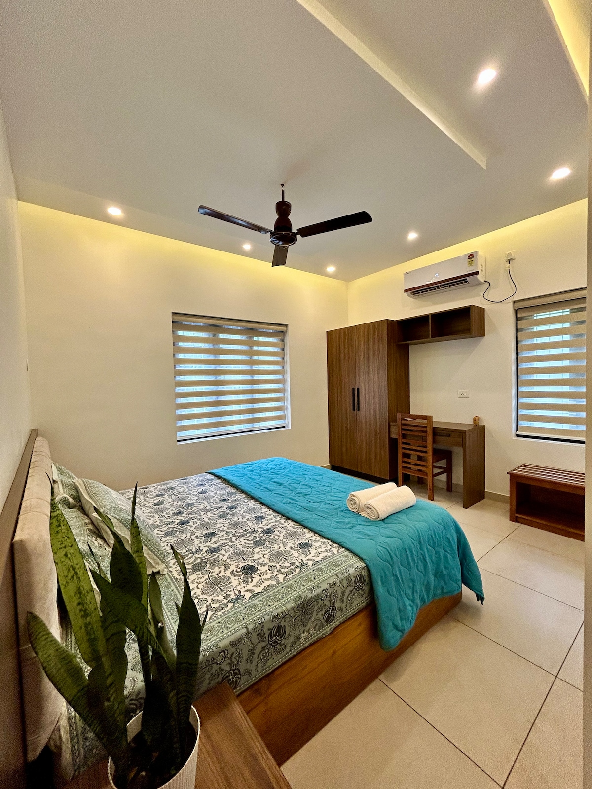 Clean and quiet premium 2BHK apartment ideal for remote work and long stays. Each bedroom has AC and a private bathroom with hot water for comfort and privacy. Dedicated workspace with desk and chair. Fast, stable WiFi suitable for video calls. Power backup. Mini kitchen with fridge, induction stove and kettle. Washing machine for extended stays. TV included. Private balcony — perfect for morning coffee, focused work or evening downtime. Located in a calm area, 10-minute walk to the beach.
