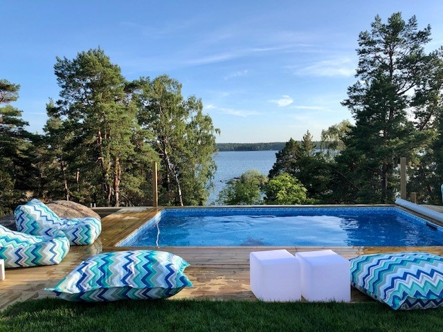 House by the sea on a jetty👍Enjoy the hot tub and wood-burning sauna. Fantastic outdoor environment. Modern and fully equipped house, tastefully decorated. Perfect experience for those who want to have a relaxing and beautiful time on the water🌞 If you want to be active: canoe, hike in the nearby national park, go for a run or go boating. All this just 30 minutes from Stockholm! Imagine spending a few days or weeks in this environment 😀 - All space is privately available to you as guests.