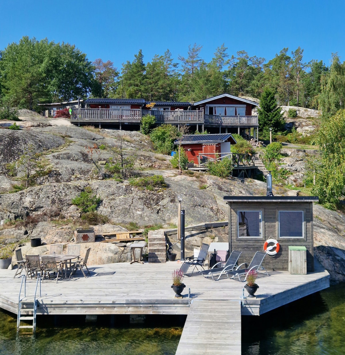 House by the sea on a jetty👍Enjoy the hot tub and wood-burning sauna. Fantastic outdoor environment. Modern and fully equipped house, tastefully decorated. Perfect experience for those who want to have a relaxing and beautiful time on the water🌞 If you want to be active: canoe, hike in the nearby national park, go for a run or go boating. All this just 30 minutes from Stockholm! Imagine spending a few days or weeks in this environment 😀 - All space is privately available to you as guests.
