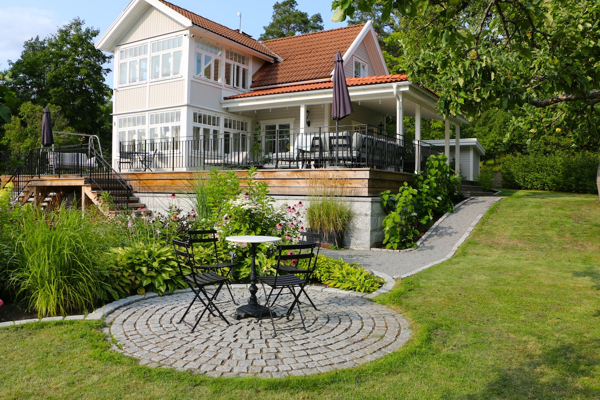 -Skärgårdsvilla i fantastisk miljö från 1922 som ligger precis vid vattnet. -Jacuzzi för bad i solnedgången, -Sol från morgon till kväll och 300 kvm soldäck. -Vacker sjöstuga med stor dubbelsäng. -En härlig lounge miljö under tak med både utekök och grill. -Bryggan vid sjön är perfekt att starta dagen på med ett dopp i sjön och morgonkaffet -2 kajaker, roddbåt och SUP bräda finns om man vill ut på vattnet. -Snabbt wifi och 65" LED TV med stort TV-paket. 400 år gammal ek i trädgården