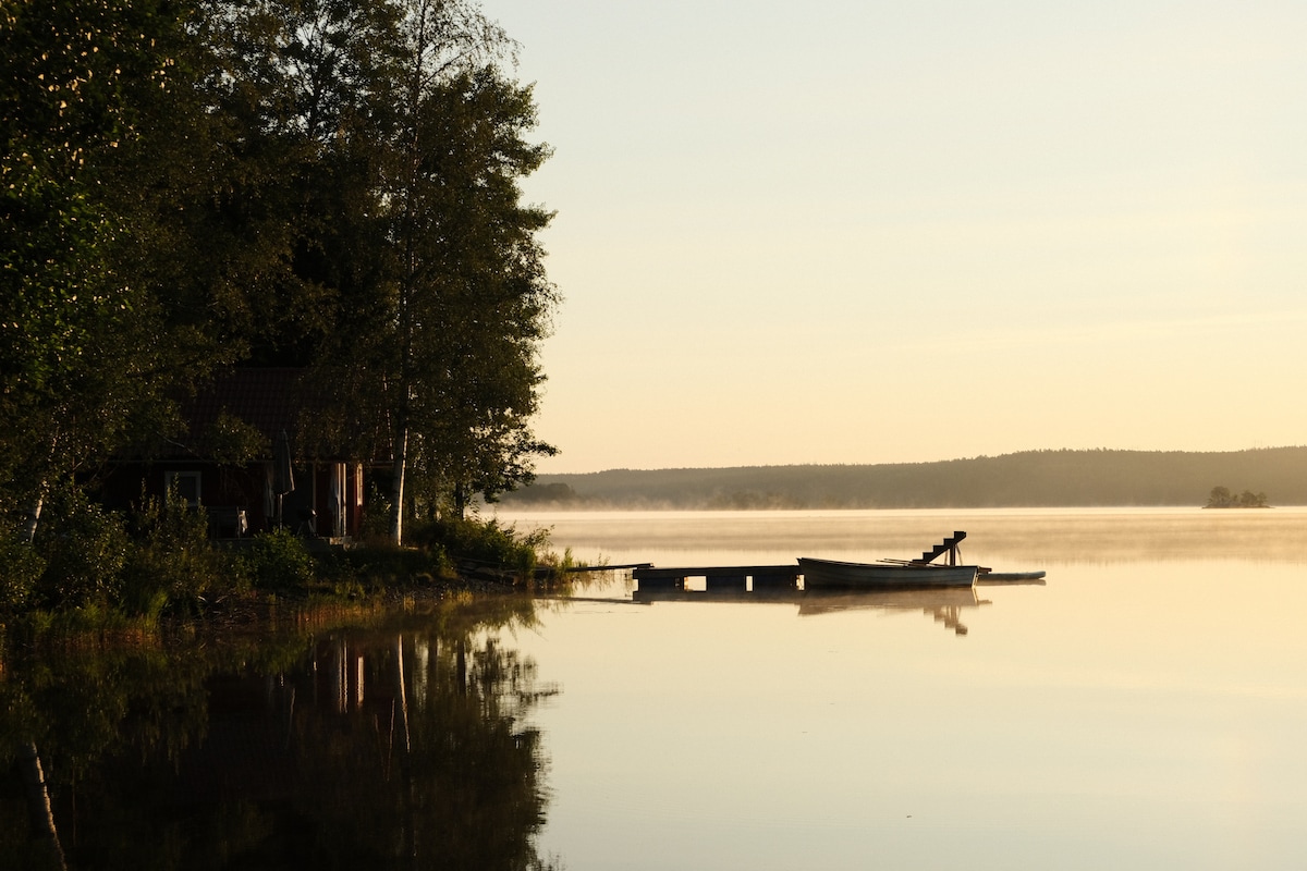 Boende där du sköter dig helt själv och kan njuta av lugnet och den fina utsikten. Bra sjösystem för SUP el båt och utmärkta vandringmöjligheter i skogarna runtom. Fullt utrustad stuga där du kan elda i kaminen inne eller tända en brasa vid grillplatsen som ligger ostört från andra grannar. För största naturupplevelsen kan ni nyttja båten som ingår. Den eldrivna motorn gör att du kan glida fram ljudlöst genom de lummiga kanalerna precis runt hörnet. 10 min från shoppingcenter