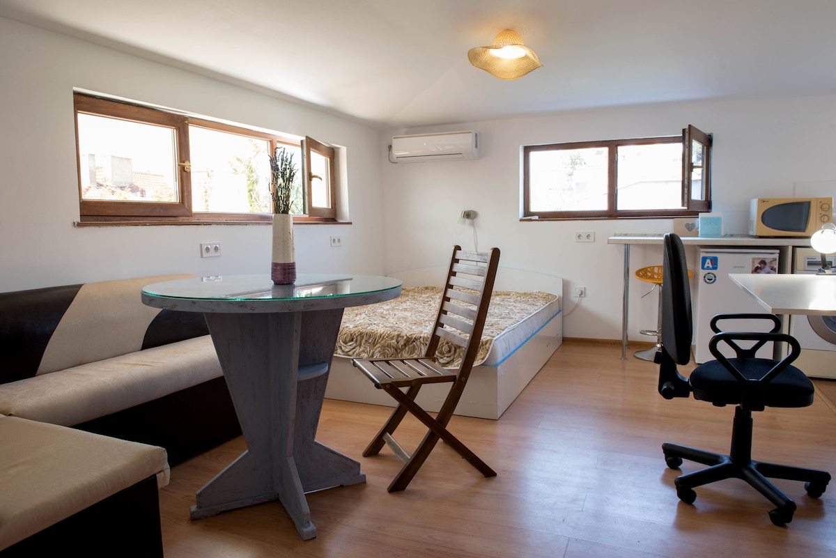 This little treasure is located in the heart of the city, next to the main pedestrian street. A 5-minute walk from the Sea Garden and the University and 10 minutes from the beach. All restaurants, cafes and shops are just a stone's throw away. It consists of a walk-in space, a double bed, a kitchenette and a bathroom. AC, free Wi-Fi and a large TV with interactive TV. Refrigerator, microwave, hot water kettle and kitchenware. Located on the 5 floor (no elevator). 12 bus stops from the airport.
