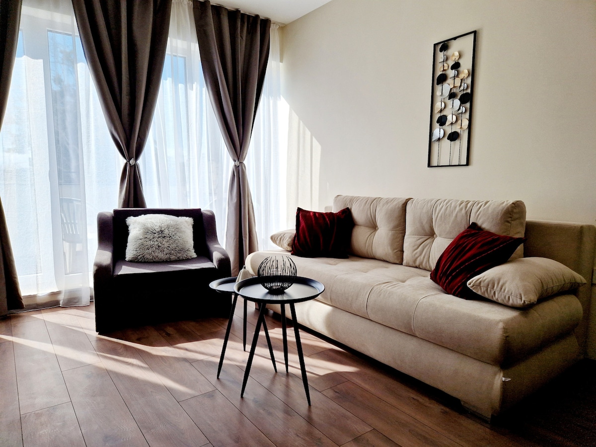 A cozy apartment featuring a beautiful glass-enclosed veranda, perfect for morning coffee, relaxed evenings, or remote work with natural light, just a short walk from Kabakum Beach and the Riviera coastline. Enjoy free access to the beaches, nearby mineral springs, cafés, and seaside restaurants. A comfy bed, a folding sofa, high-speed wi-fi, 2 workplaces with comfortable chairs, and a fully equipped kitchen make it perfect for relaxing stays, remote work, or exploring Varna and Golden Sands