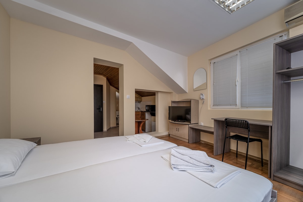 Relax in Province Stone House Varna in our vast 50 sq.m. room with a balcony and terrace revealing wonderful views of the forest and the city. The room is equipped with a kitchen, refrigerator, washing machine, oven, hobs, microwave, etc. There is a double king size bed 160/200 cm, and upon request, we offer a sofa bed with a memory foam mattress for your comfort. Parking is free in the courtyard. The swimming pool is included in the price and is open from 10 am to 8 pm. Come and enjoy!🌞