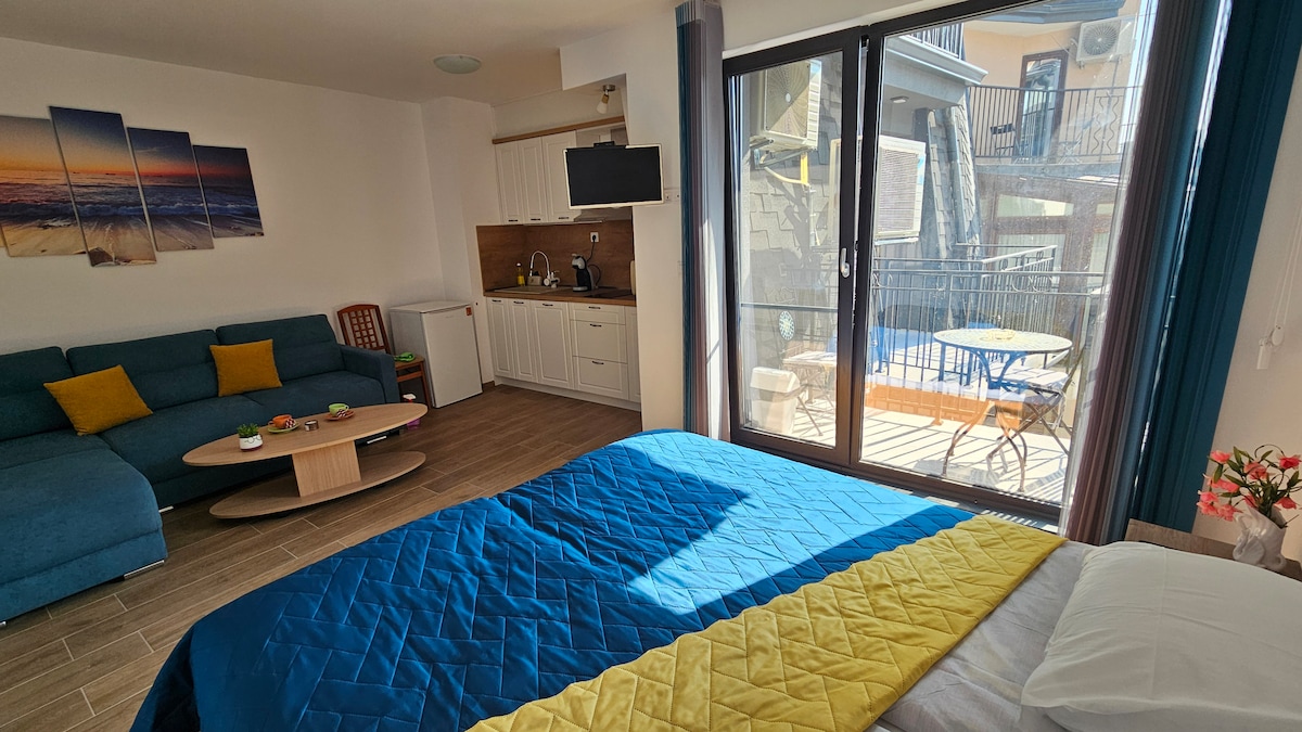 Admire the view of sea and trees from the sunlit balcony of our elegant studio apartment. It has everything you need for your stay and even more — AC, smart and cable TV, Wi-Fi and kids amenities. The kitchen is fully equipped with cooking facilities, fridge, dishwasher, washer and dryer. We're within walking distance to the beach, public transport, restaurants. Varna Center is 13km away, Airport — 20km.