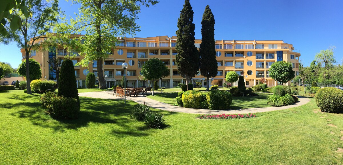 Изцяло новообзаведен апартамент с изглед към морето в най-зеления и тих квартал на град Варна.В непосредствена близост до морската градина - две минути пешеходно разстояние. Намира се на пет минути с автомобил до центъра на града и десет минути с обществен транспорт и на 1 км от плажа. Жилището се намира на 4-ти етаж(от общо 5)и разполага с 1 спалня, всекидневна с разтегателен диван,напълно обурудвана кухня,тераса с кът и баня. Паркирането е безплатно и мястото разполага с детска площадка.