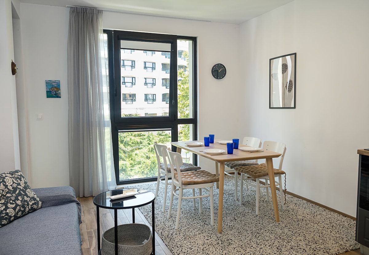 Seaside Escape with Stunning Sunrise Views | Pool | SPA and free parking Enjoy your stay in this brand-new apartment in Skyline Apartments. Start your day with a coffee ☕️ and a breathtaking sunrise over the sea from the balcony. 🌅 🛋️The apartment is fully equipped for a perfect vacation and includes a modern kitchen and a cozy living space. The complex offers a seasonal pool 🏊🏼 (May-September), SPA - sauna, jacuzzi and steam bath 🧖🏻♀️ and a beautiful garden🌷⛲️