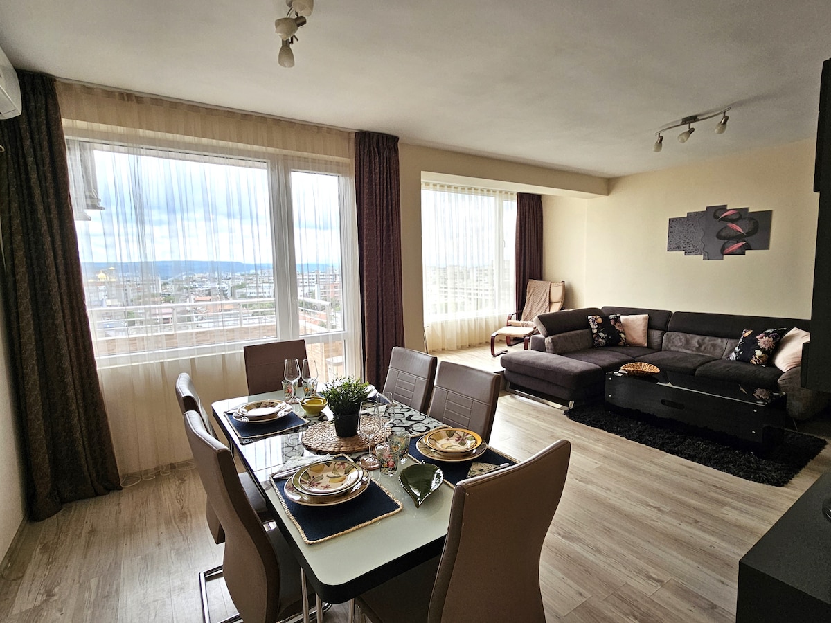 Our spacious two-bedroom apartment has an amazing view that we want to share with you and lots of sunlight in the rooms. We are situated at the beginning of the central pedestrian zone where you can find a large variety of restaurants and bars as well as places that celebrate the cultural arts. The Sea Garden, the beach and the marina are 10-15min by walking. There is direct access to public transport in front of the building that will lead you to the Mall, Airport and Golden Sands.