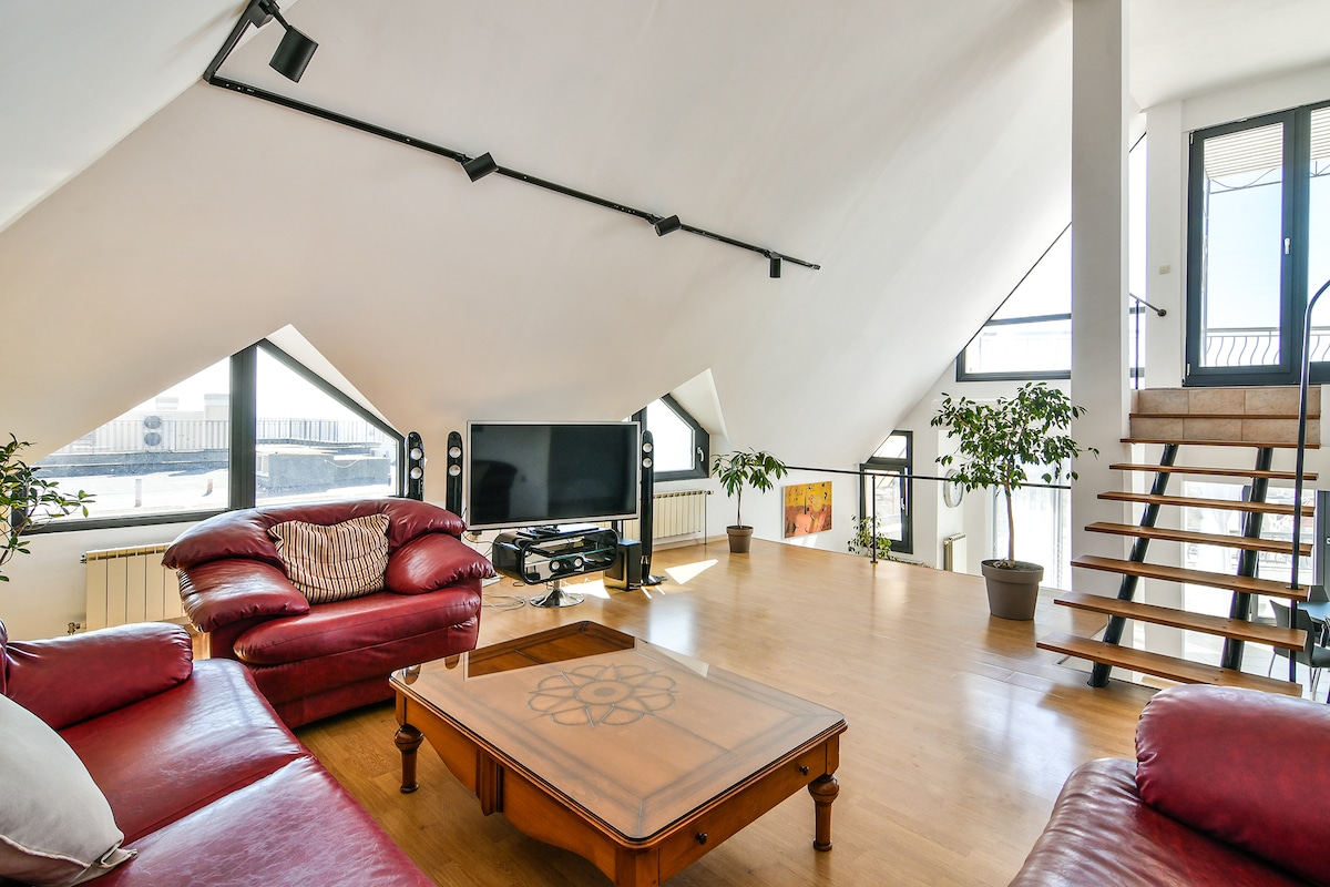 The apartment is located on the top floor in a luxary building with an elevator right next to the main pedestrian zone, restaurants and bars. It is fully equipped for a comfortable stay, and has an amazing spacious and sunny terrace with a spectacular view of the city skyline. All the furniture is unique, selected with great taste. All necessary appliances are available. NO FREE parking available during week days.