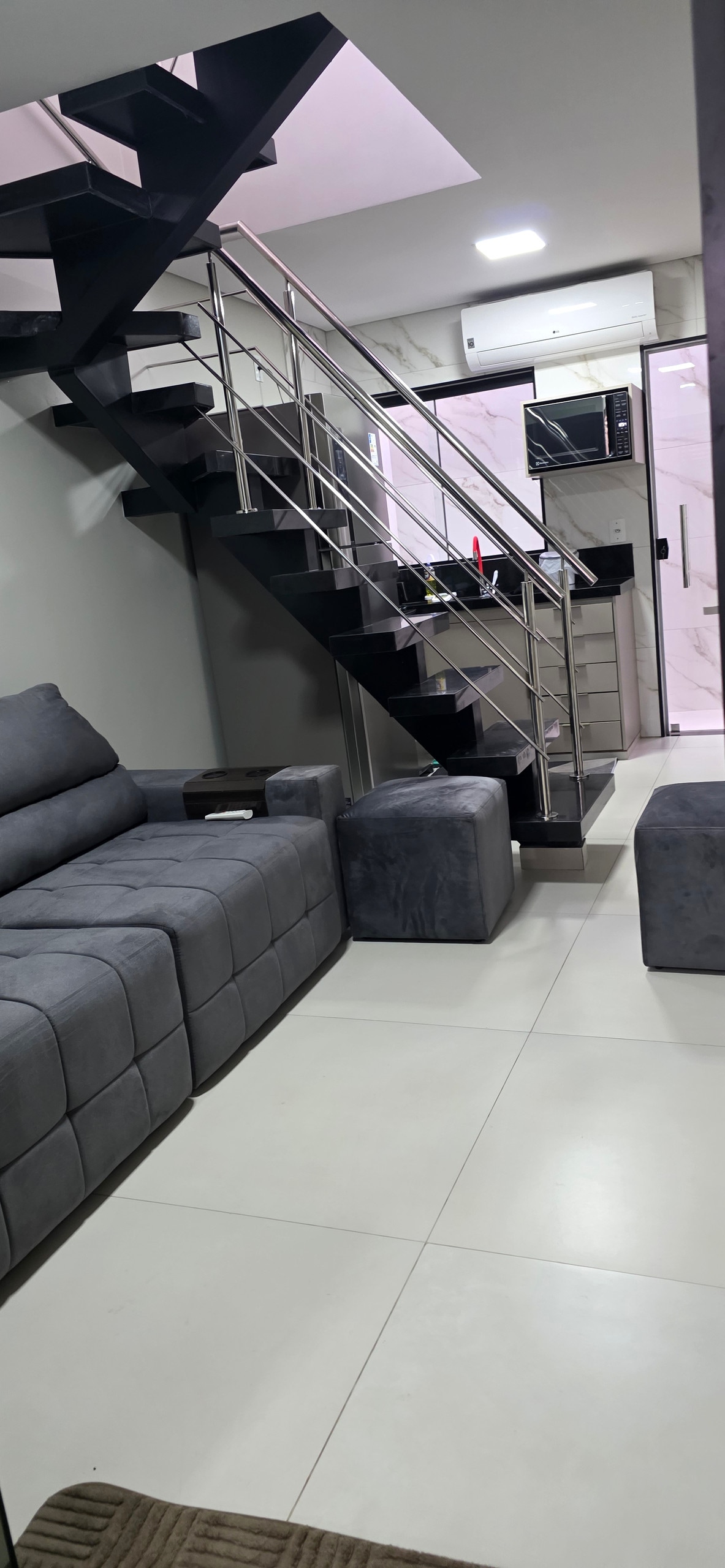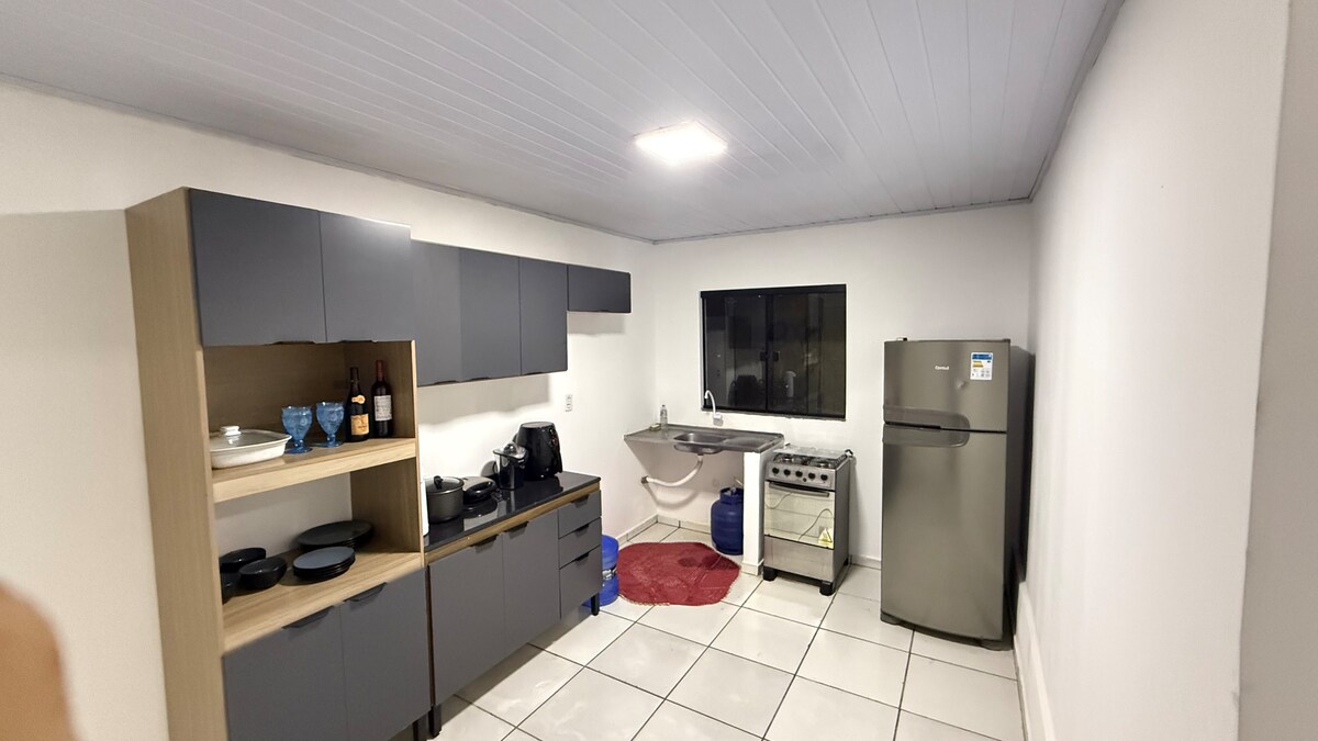 Espaço confortável, seguro, com ar condicionado no quarto, cozinha completa com fritadeira elétrica, área de serviço com máquina lava e seca. Estacionamento com portão eletrônico para carro e moto.