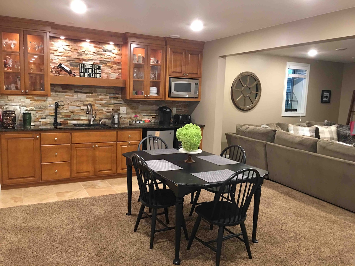 Peaceful retreat down gravel driveway 15 min from Mayo Clinic. Enjoy your own apartment with private backyard walkout entrance to the lower level of our home. You will have a bedroom, living area, kitchenette with mini fridge, microwave and toaster oven (no conventional stove/oven), bathroom w/ tub & shower, pingpong table, laundry, and patio with fire ring. You may hear piano music weekday afternoons, since I give lessons (usually 3-6 pm; a bit earlier in summer) NEW HEATED FLOORS w/thermostat