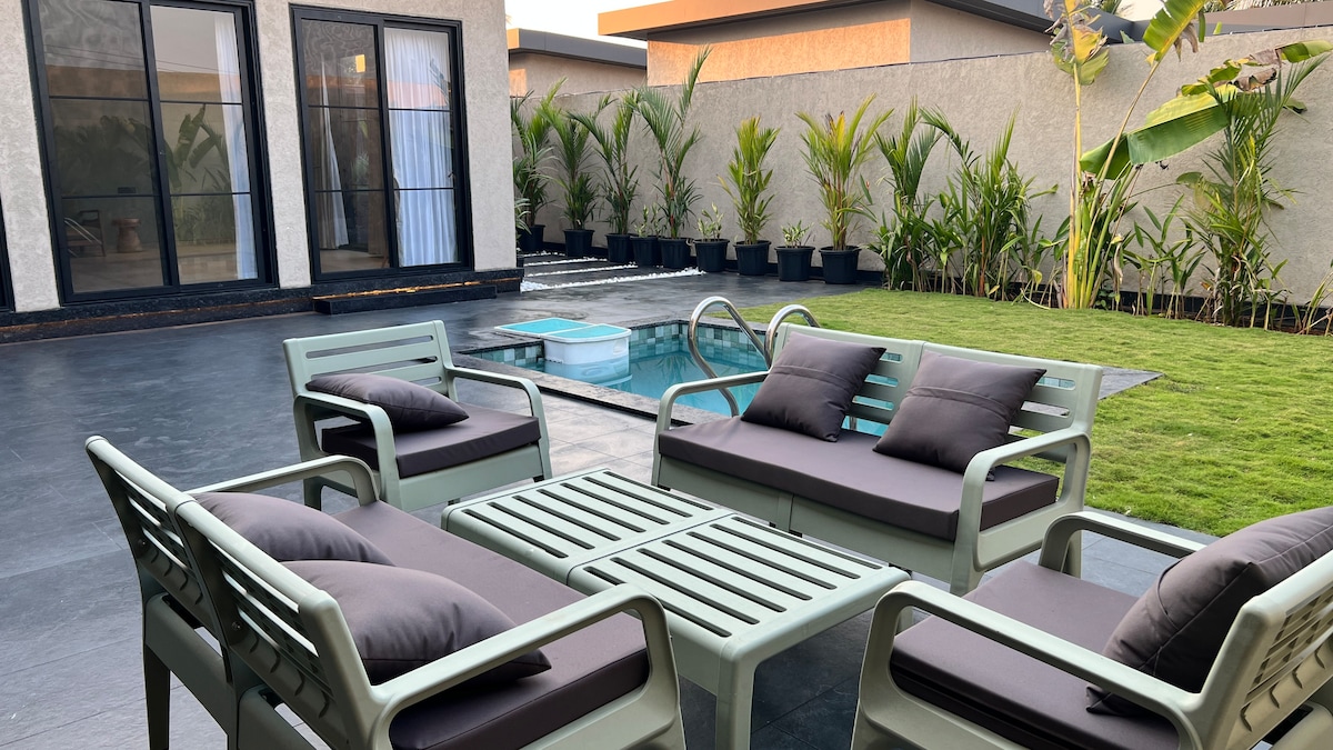 'Villa Elsewhere' is a luxurious, beautiful, private pool villa, just 60-90 mins drive from Mumbai. Surrounded by lush green views of fields, hills, and sounds of nature. The Villa has 3 AC en-suite bedrooms, a large AC living room that opens into a private pool and large deck with a Bar. The kitchen is fully equipped where a chef can make delicious meals (*extra charge). It is pet friendly (*extra fee). BOOK to relax in a calm peaceful vibe, for a get together, or to host the best part ever!