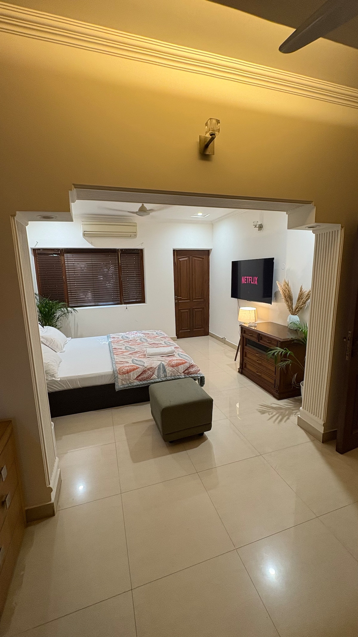 Welcome to our bright and cozy Airbnb! You'll find a well-lit bedroom with a walk-in closet and a private bathroom. The living area is comfy with a sofa cum bed, TV, and some books, plus a handy mini fridge. Step out onto the balcony to relax in the seating area. The bedroom and living room both have AC to keep you cool. You'll have plenty of privacy, a workspace with fast internet, making it easy to work and relax. Enjoy your stay with all the comfort and convenience you need!