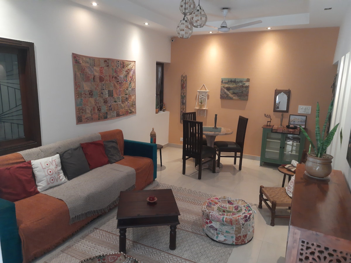 My home is located in an upscale colony of south Delhi and comfortably furnished to accommodate families or single people from all over. It's in a quiet neighbourhood , and located very close to the Airport .It is fairly close to some tourist attractions and offers a great shopping experience as it's just a five minute drive from the three most prominent malls in South Delhi.Closest metro is at vasant vihar a 10 minutes drive. The house is on the third floor. No lift in the building.