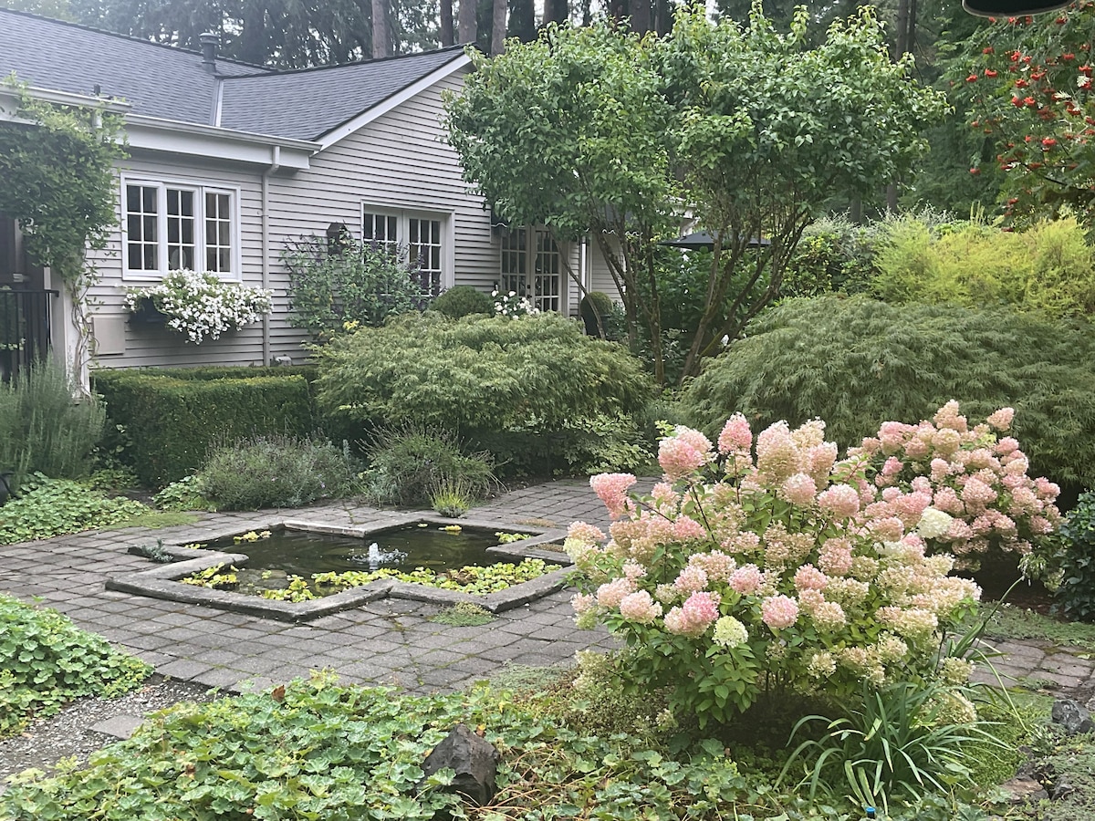Enjoy this historical backyard Cottage with a peaceful setting and charming decor. One quiet bedroom with high-quality queen mattress, pillows, and linens. Ensuite tiled tub/shower bath. A light-filled updated eat-in kitchen with Ikea cabinetry and dishwasher is fun to make meals or snacks. Very cozy living room has a peek view of the seasonal pond through white curtains, and inviting seating. You will find a white cubby cabinet desk for your computer time. Perennial gardens, sun, moonlight!
