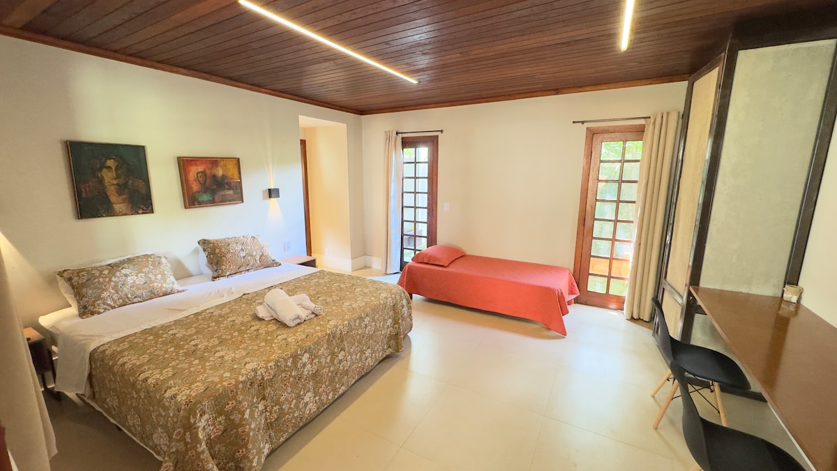 Chalé a 8 minutos do centro de Vassouras, extremamente silencioso, e em contato com a natureza. Possuímos 2 camas casal e 2 solteiro; Tv; 1 banheiro interno e outro externo; frigobar; fogão eletrico; microondas; galpão gourmet com geladeira, cooktop; piscina;ducha; churrasqueira; campo de futebol.