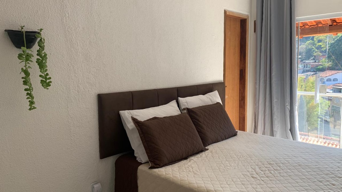 Hospede-se num espaçoso e aconchegante apartamento para 6 pessoas,podendo comportar até dez..Uma suíte mais dois quartos,sofá cama na sala.Localizado muito próximo ao Centro Histórico. Oferece vista para as montanhas, canto de pássaros, estando à metros de: mercado, padaria, farmácia, posto de gasolina, loja de conveniência, bob's e boliche. Duas vagas de garagem.Você viverá momentos inesquecíveis com passeios imperdíveis à fazendas históricas, jardim ecológico, museu, praças e boa gastronomia.