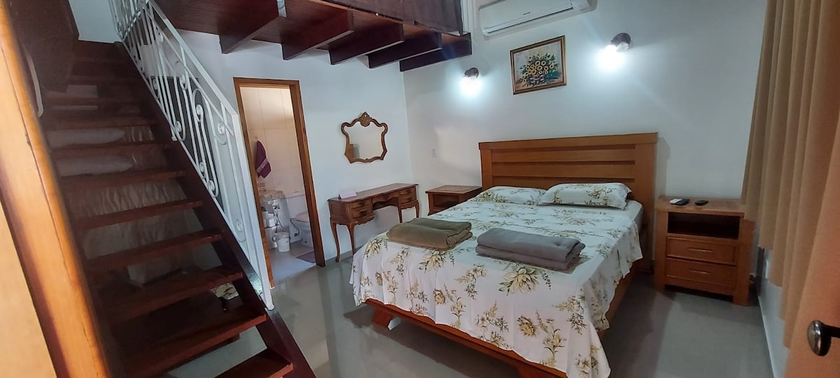Um refúgio familiar, cercado por flores e cuidado em cada detalhe. A casa de hóspedes é um espaço completo com cozinha charmosa, sala aconchegante e quarto acolhedor, com ar condicionado. Acomoda até 3 pessoas com conforto. Na área externa, um espaço com churrasqueira e banheira hidromassagem para relaxar. Vaga segura para carro e moto, jardim florido e localização perfeita: pertinho do centro, mas com clima de paz e sossego.