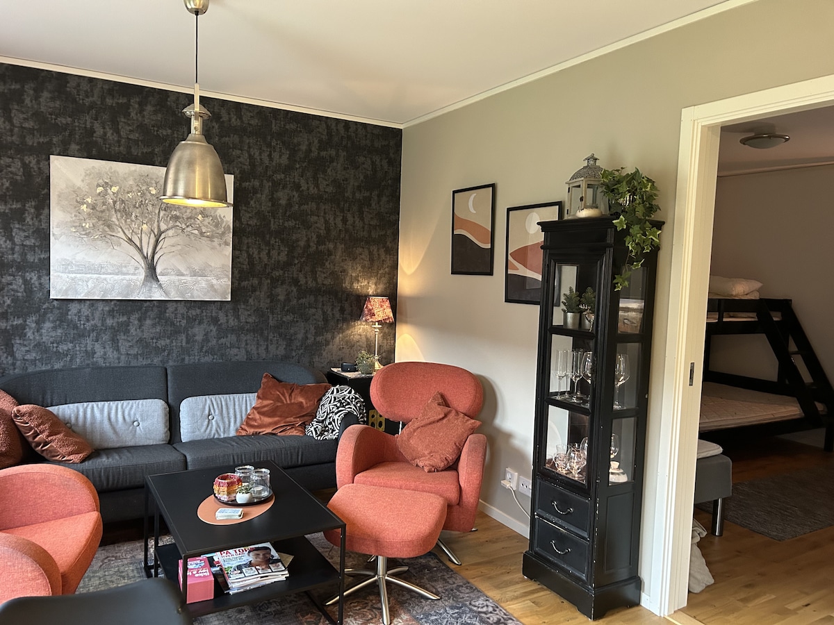 Apartment beautifully situated next to lake with bathing area and good fishing waters. Own entrance five steps down in single-family house. Two bedrooms, fully equipped kitchen with dining area, hall/desk area, shower and WC. TV with Chromecast. Free wifi, 1gb fiber connection. - Free parking - Regular wall routlet for engine heater/EV charge at cost price - About 100m to the bathing area - Free loan of bike, kayak and rowboat in summer - Easy check-in via a locked key cabinet - Self catering