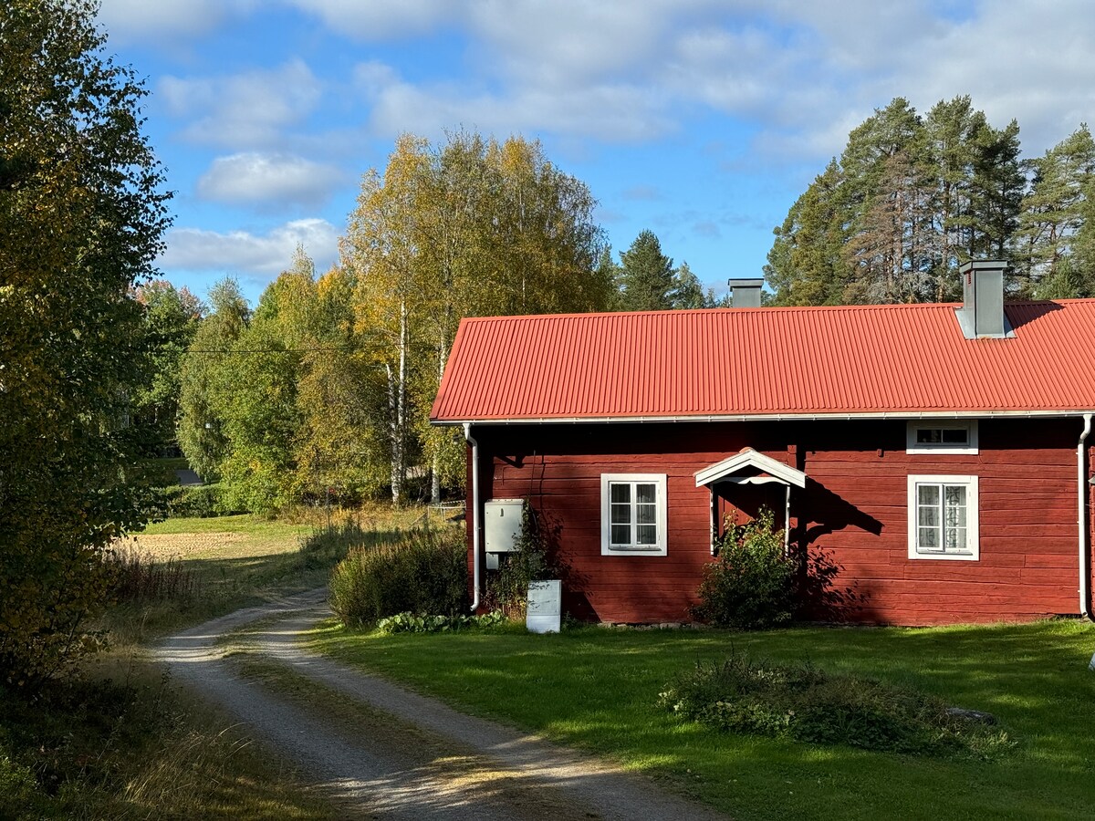 Guest house with small kitchen, stove and fridge, four beds all ready made, bathtowels and small towel for all guest. Outdoor Shower and outhouse, outdoor furniture and barbecue area near and down the lake. Wifi is available. There is a sauna down the lake and a boat included. Sometimes neighbors sharing the bathing place. Firewood is included for sauna and barbecue.