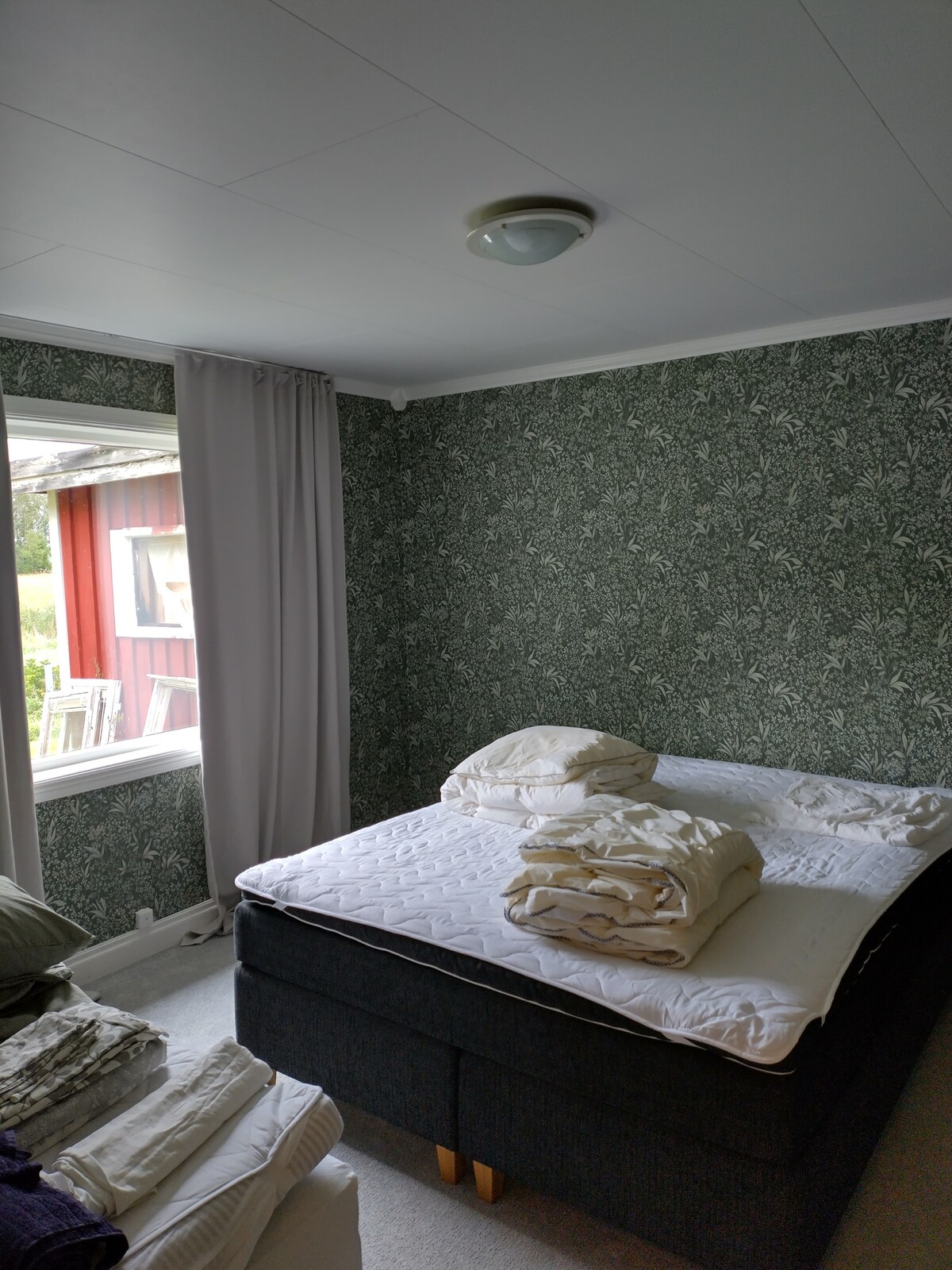Bekvämt och charmigt boende i eget hus på vår gård som ligger nära havet med en kort promenad till badstranden. Njut av lugnet och närheten till vacker natur och unika utflyktsmål. Gästhuset ligger avskilt på gården med utsikt och sol hela dagen. Gården ligger vid foten av ett litet berg där man kan gå upp för milsvid utsikt över havet. Självhushåll med egna lakan och handdukar. Städning ingår i totalpriset.