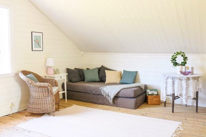 This charming cottage is situated on an island with the living room overlooking the estuary. There are sleeping possibilities for five people: one bedroom with a bed and a loft with three comfortable bed mattresses. There is one bathroom and a fully equipped kitchen. There is also a washing machine in the cottage. This is a perfect place to relax and enjoy the rich nature that the island gives. Explore it by foot or bikes.