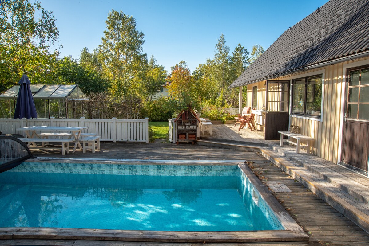 Koppla av i detta härliga boende. Det Gotlands inspirerade gästhuset ligger i Västervik. Här bor ett par eller en familj med små barn i delad dubbelsäng/spjälsäng bekvämt med badrum, kök och öppen spis samt soldränkt altan och pool för svalka. Gångavstånd till ett dopp i havet och inom cykelavstånd både stränder och klippor. Västerviks stadskärna, årets sommarstad 2020 och 2021 bara 2 km bort, med restauranger, caféer och trevliga butiker. Perfekt för en avkoppling på ”bästkusten ”