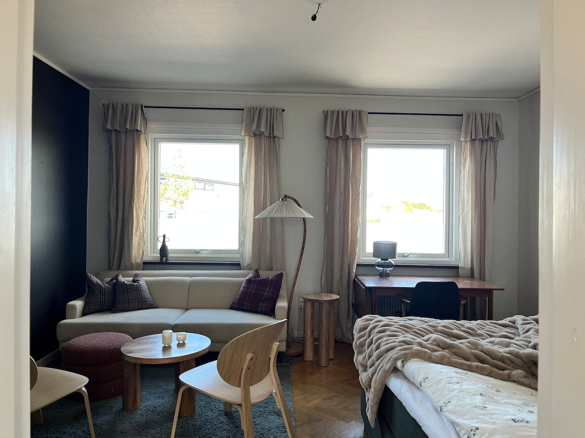 Studion ligger i centrala Eskilstuna med ån ett stenkast utanför köksfönstret och gångavstånd till restauranger, pubar, butiker, parker och tågstation, (1h till stockholm.) Boendet -Bottenplan i ett litet charmigt 1800-talshus med kakelugn (och lutande golv) med 2 andra lägenheter. -egen ingång -ett större rum ca30 kvm -kök med kokplattor, mikro, kylskåp och kaffebryggare -badrum med dusch och toa, handdukar ingår -1 säng 120 cm -wifi -gratis parkering kan finnas vissa dagar, hör vid bokning