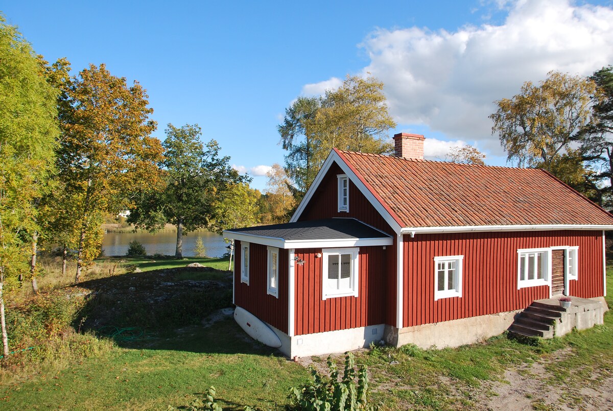 Traditional red Swedish cottage with white trim in a secluded lakeside setting. Fully modernized with AC throughout, winterized and warm year-round. Escape here together without neighbors or traffic noise to disturb your peace. Wake to birdsong and lake views. Enjoy morning coffee on the terrace as mist lifts from the water. In the evening, set the ambient lighting and end your day with a movie on the projector or a sunset boat trip. Perfect for couples seeking tranquility and quality time.
