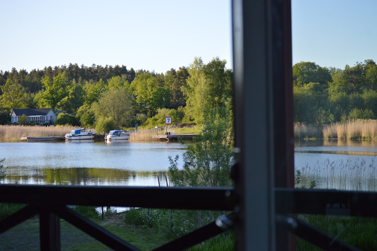 Sommarstugeidyll med direkt sjöläge och alla bekvämligheter. Avskilt och privat läge med fri utsikt i västerläge (sol hela eftermiddagen och kväll) men samtidigt är stugan samtidigt del av en liten by där det finns fotbollsplan, lekplats för de mindre barnen och en större gemensam badplats med klippor (ca 5 minuters promenad). Egen brygga för måltider direkt vid vattnet och badbrygga direkt i anslutning till tomten (ca 50 meter nedanför huset). Roddbåten tar 4-6 personer och fiskredskap finns.