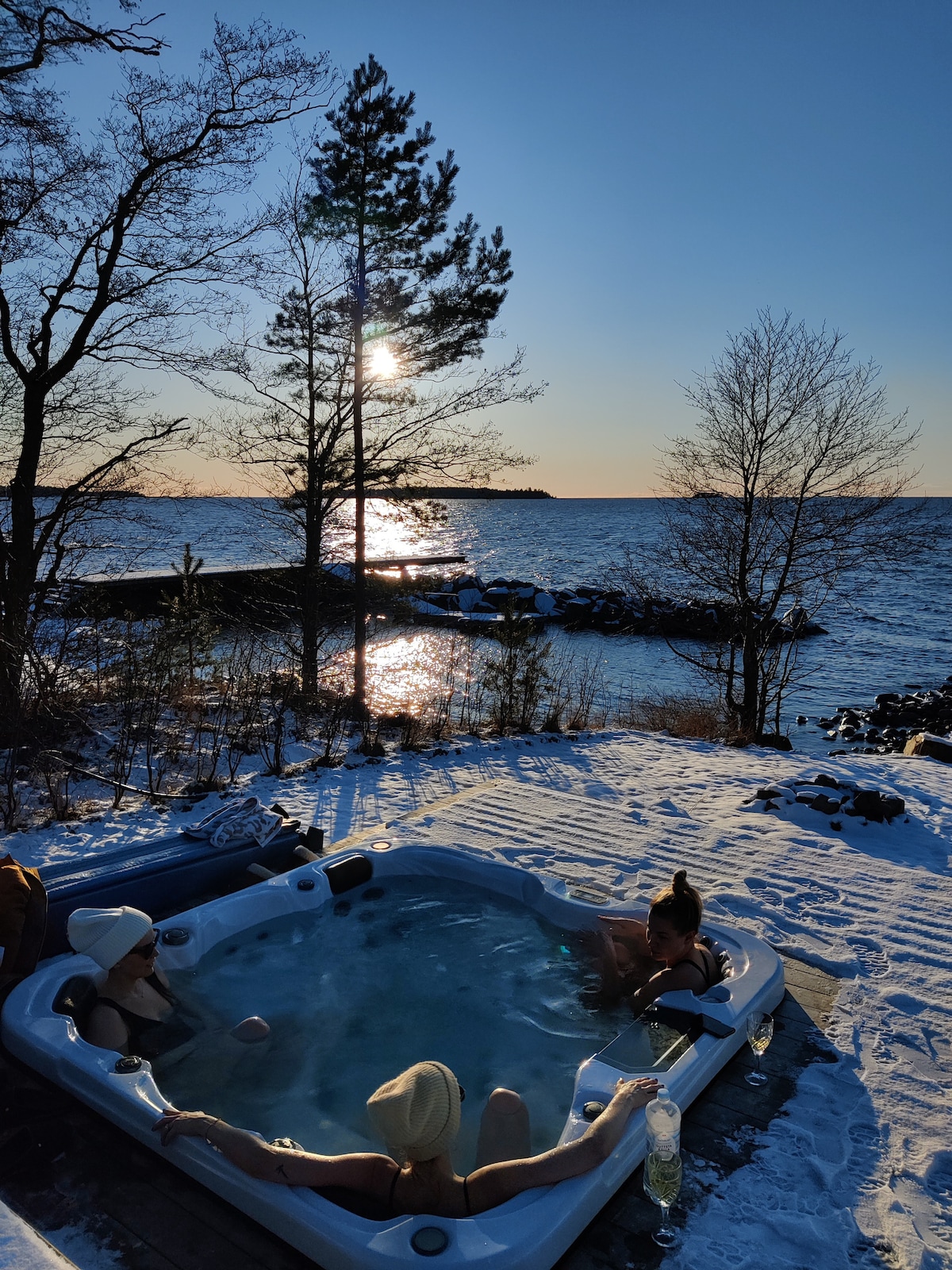 Welcome to our cozy cabin! Nestled by the edge of a peaceful pool, you'll find a hot tub that comfortably accommodates up to five people, offering a stunning panoramic view of the lake. The jacuzzi and sauna is available year-round. The swimming pool is open until 6th of October, perfect for cooling off during warmer months. We also provide two paddleboards. Nature is just outside your door and in the evening you will watch the sun set over the lake. We look forward to welcoming you!