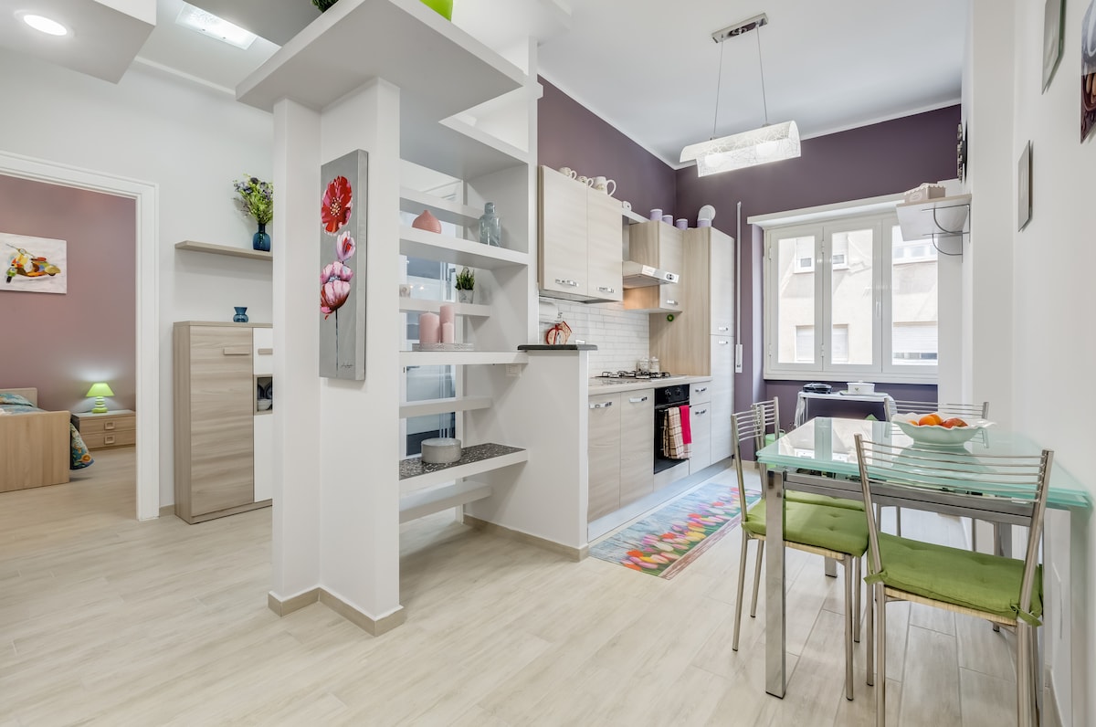Just 200 m from the Vatican Museums, in an elegant historic building, this apartment blends timeless charm with modern comfort. 1904 floors, late 19th-century tiles, and Tiffany-style glass coexist with contemporary amenities. Furnishings from European capitals create a refined, warm atmosphere where every detail tells a story, making your stay in Rome unique and unforgettable.