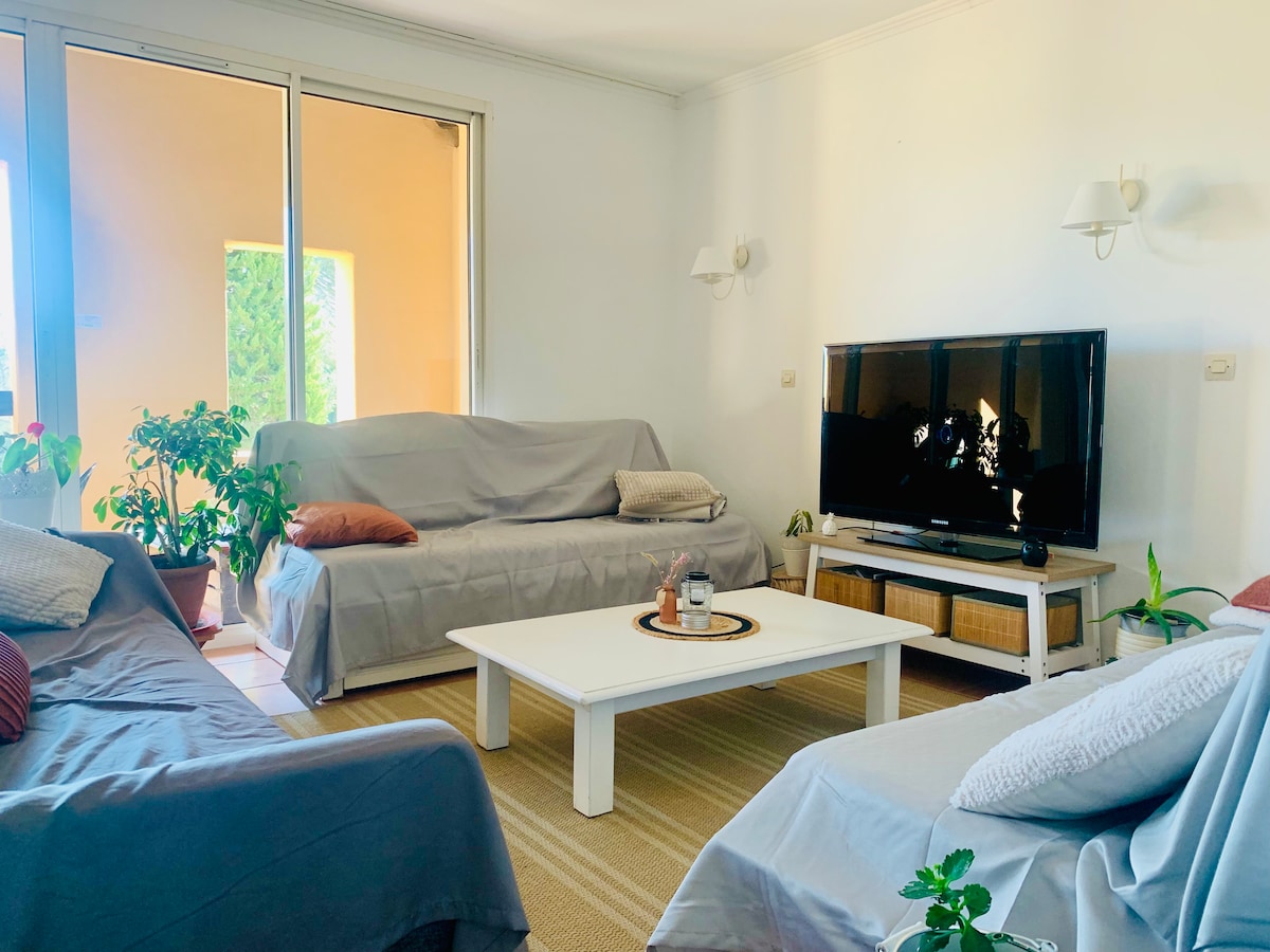 Meublé de tourisme classé 4 * : 65m2 dans écrin de verdure. La terrasse privative donne sur une forêt de chênes et de pins avec vue sur les collines. Une chambre avec un grand lit (qualité hotellerie) et une salle de bain attenante + une cuisine ouverte toute équipée et donnant sur un salon avec 2 banquettes-lits simples. Équipement complet, piscine partagée avec les propriétaires Nous serons ravis d’échanger sur les bonnes adresses de la région si les voyageurs le souhaitent.