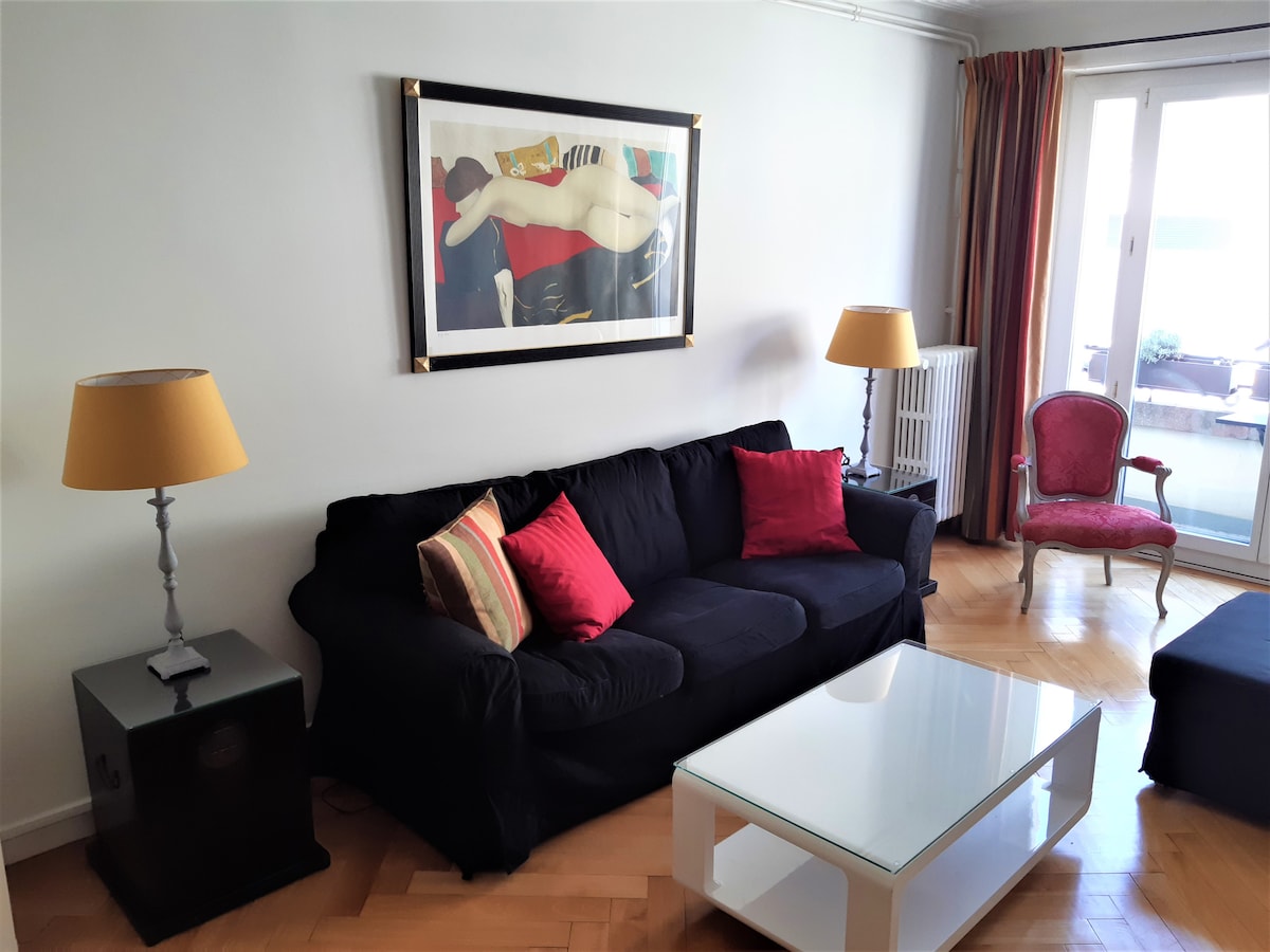 Un magnifique appartement vaste et lumineux, calme, confortable et accueillant. près du centre et bien desservi par les transports en commun, 2 chambres, 2 salons, 1 grand balcon, 1 salle de bain, de belles pièces à vivre. 2 lits doubles et possibilité de rajouter 2 matelas d'appoint. Parking au disc dans la rue (toujours de la place) ou 15CHF la journée; sinon place de parking couvert possible (environ 20CHF/jour selon durée du séjour et disponibilités). Au plaisir de vous accueillir!