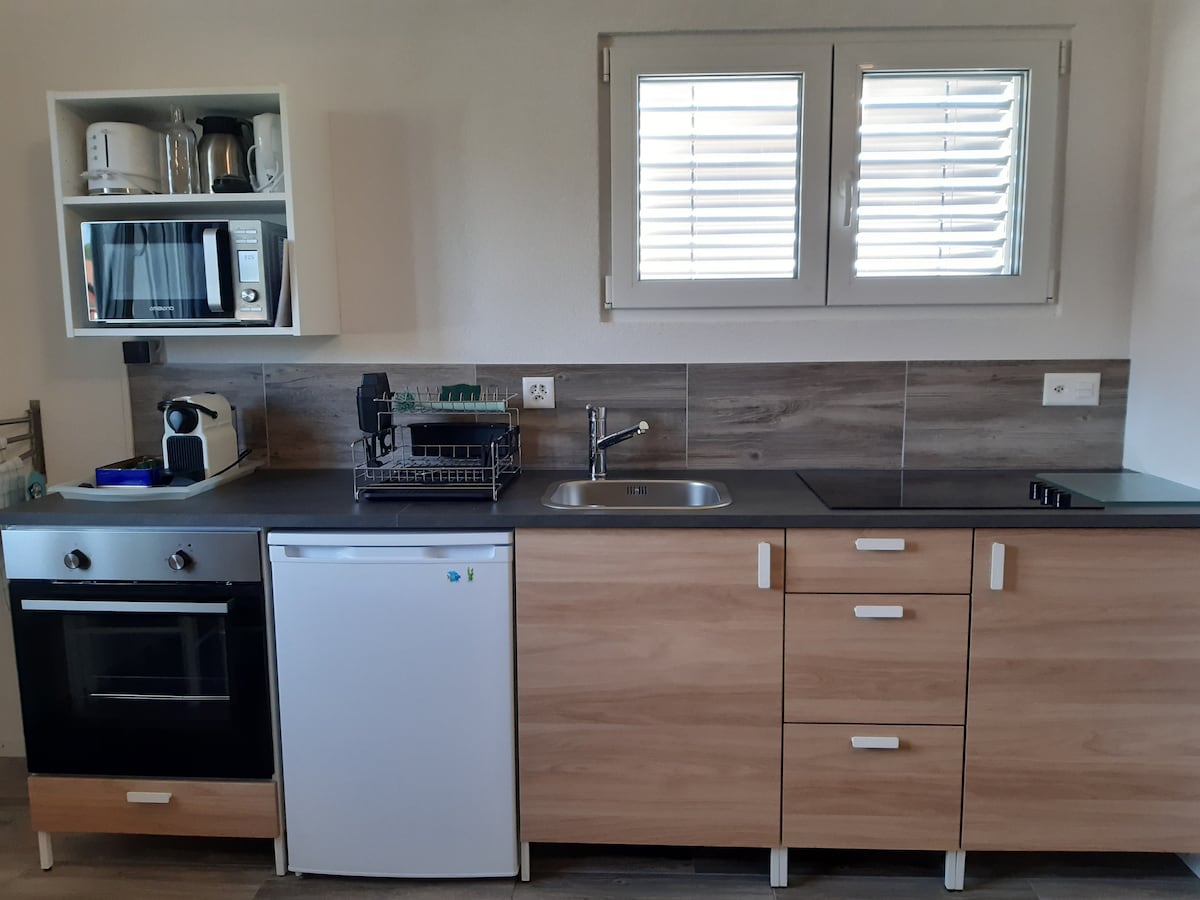 Studio rénové à Bevaix, idéal pour 1 à 3 personnes. Cuisine équipée, lit double, coin repas. Quartier calme avec parking gratuit. Accès piscine partagée (en saison). À 5 min du lac en voiture, 15 min à pied. Bus à 5 min, gare à 15 min. Check-in autonome. Frais de ménage : 35 CHF.